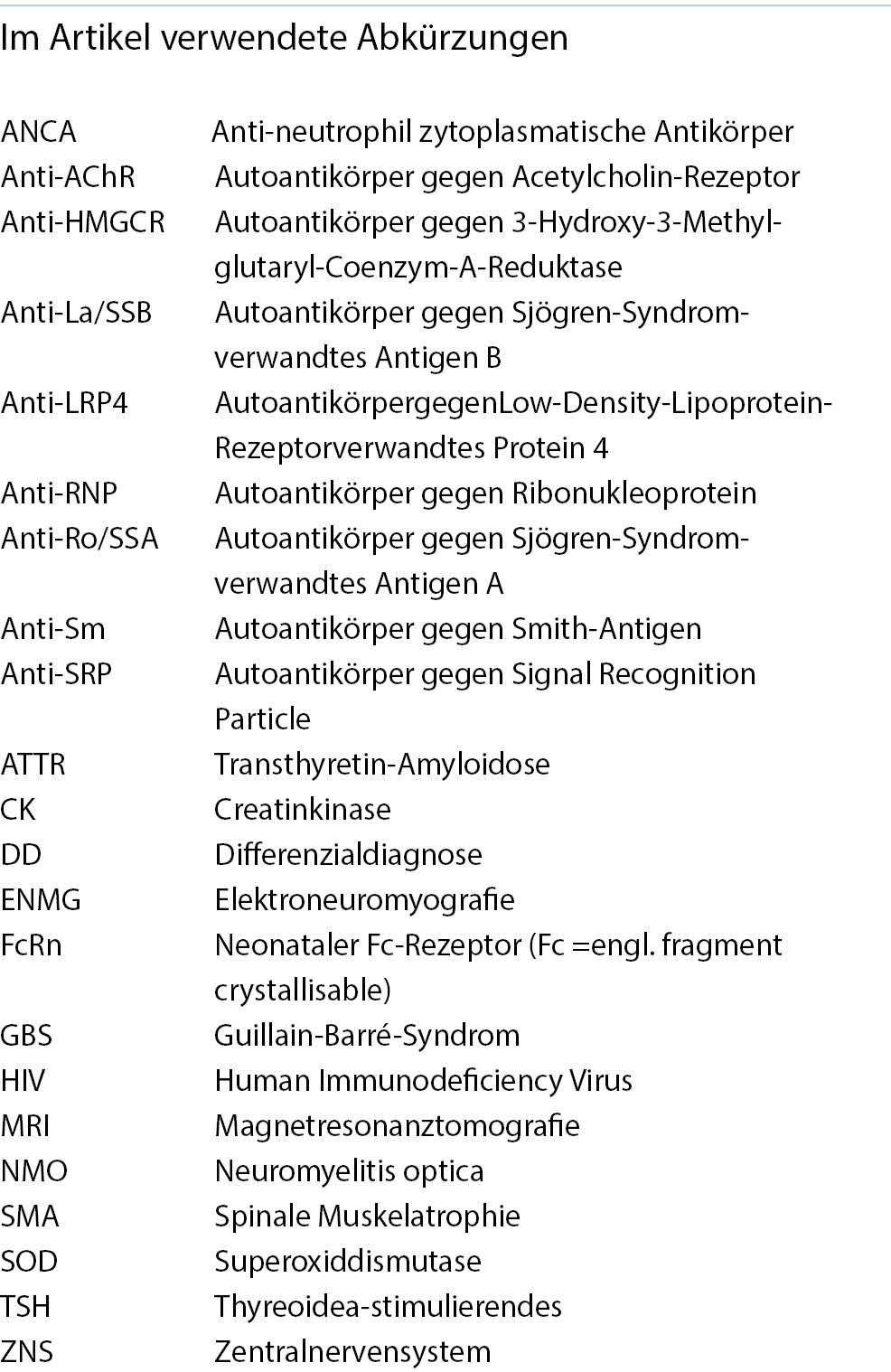 Immunologische Parameter sind erforderlich, wenn eine Myasthenie (Anti-AChR, Anti-MuSK, selten Anti- LRP4), inflammatorische Ursache (z.B. Anti-histidyl-t- RNA Synthase [anti-Jo-1], Anti-HMGCR, Anti-SRP) oder Bindegewebserkrankung (Anti-Ro/SSA, Anti-La/SSB, Anti-Sm, und Anti-RNP) vermutet wird.