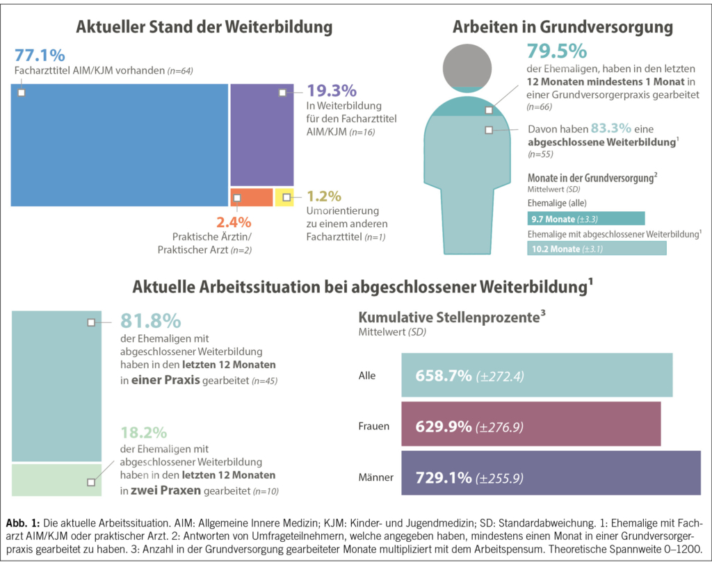 Konkret ermöglichen Praxisassistenzprogramme jungen Assistenzärztinnen und Assistenzärzten, einen Teil ihrer Weiterbildung zur Fachärztin bzw. zum Facharzt für Allgemeine Innere Medizin (AIM) oder KJM in einer Grundversorgerpraxis zu absolvieren (3). Praxisassistenzen stellen für junge Ärztinnen und Ärzte eine konkrete Möglichkeit dar, eine Alternative zur klassischen Spitalmedizin kennenzulernen bzw. zu erleben und damit ein potenzielles Karriereziel zu entdecken. Gleichzeitig ermöglichen die Praxisassistenzen, sich gezielt auf die spätere Tätigkeit in der Grundversorgung vorzubereiten. Die Attraktivität einer Karriere in der Grundversorgermedizin soll durch die Praxisassistenzprogramme somit erhöht und dem Mangel an Grundversorgern mittel- und langfristig begegnet werden. Zusätzlich zu den Praxisassistenzprogrammen bieten viele Kantone hausärztliche Curricula an (4). Diese bestehen neben einer Praxisassistenz aus zusätzlichen Weiterbildungsabschnitten in für die Hausarztmedizin relevanten Fachrichtungen, wie zum Beispiel der Dermatologie oder der Rheumatologie. Neben der unmittelbaren Bedeutung dieser Programme für die Ausbildung junger Ärztinnen und Ärzte erlangen gerade die Praxisassistenzprogramme für die etablierten Arztpraxen eine zunehmende Bedeutung. Viele Fachärztinnen und Fachärzte erreichen bald das Pensionsalter, und aufgrund des Nachwuchsmangels gestalten sich die Rekrutierung von ärztlichem Personal und die Übergabe der eigenen Praxis schwierig. Daten aus den Kantonen Bern und Solothurn zeigen, dass ehemalige Praxisassistentinnen und Praxisassistenten den Einstieg in die Praxistätigkeit häufig in der ehemaligen Lehrpraxis hatten (5, 6). Praxisassistenzprogramme stellen daher auch ein gewolltes Instrument der unmittelbaren Nachwuchsrekrutierung dar. Das Praxisassistenzprogramm im Kanton Zürich wurde über die letzten Jahre kontinuierlich ausgebaut, und aktuell (Stand 2024) können jährlich 42 Praxisassistenzstellen vergeben werden, wovon mindestens 8 Stellen für die KJM reserviert werden. Die verfügbaren Stellen im zweijährigen Curriculum Hausarztmedizin, mit Rotationen in die Dermatologie, Oto-Rhino-Laryngologie (ORL) und Rheumatologie, sind auf Jahre hin ausgebucht. Kenntnisse über eine erfolgreiche Nachwuchsförderung im Rahmen der Programme sowie Kenntnisse darüber, welcher Bedarf an Rotationsstellen im Rahmen hausärztlicher Curricula besteht, sind für die Organisation und den Ausbau der Programme von grosser Bedeutung. Das Ziel dieser Arbeit war es daher zu erheben, wie viele ehemalige Assistenzärztinnen und Assistenzärzte sich für eine Grundversorgertätigkeit entschieden haben und welche Rotationsstellen im Rahmen eines hausärztlichen Curriculums als sinnvoll und damit attraktiv erachtet werden.
