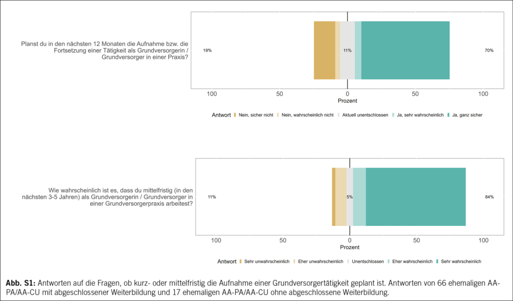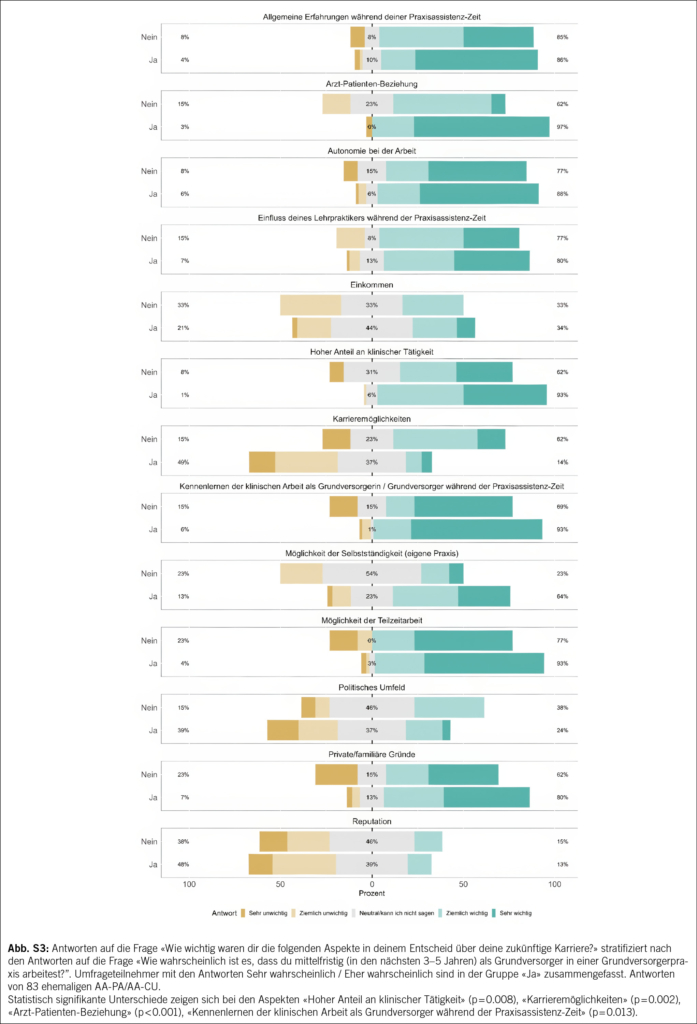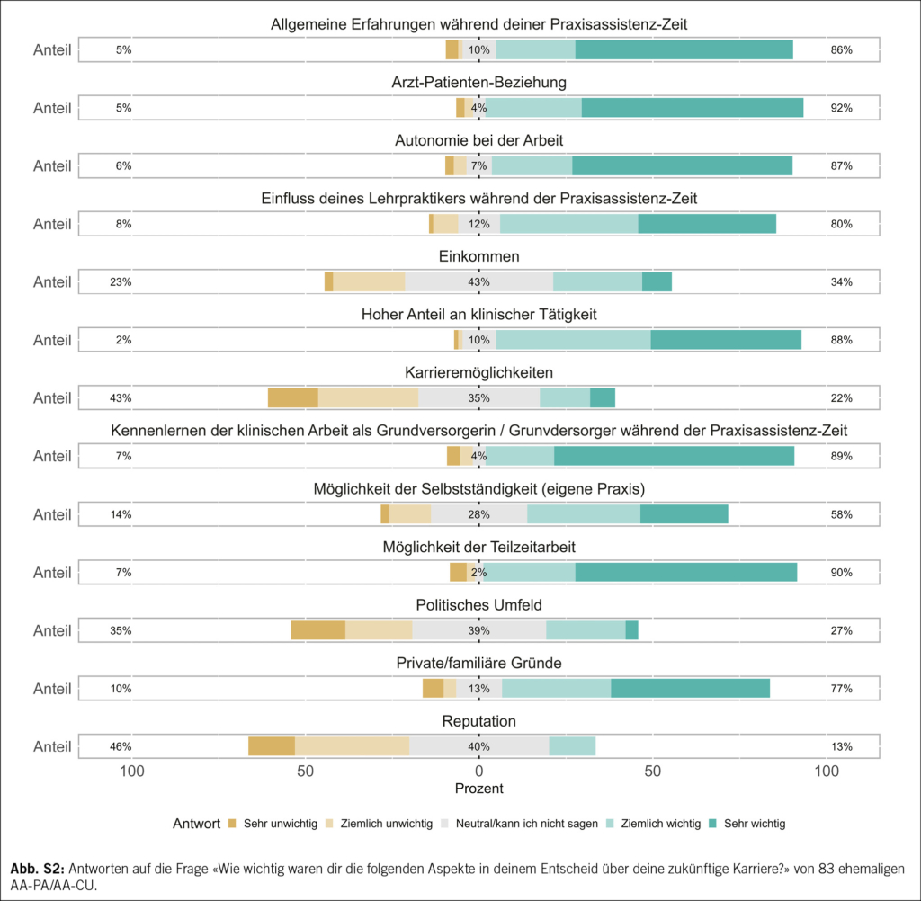 Unabhängig des aktuellen Weiterbildungsstands planen 70 % bzw. 84 % kurzfristig bzw. mittelfristig die Aufnahme einer Grundversorgertätigkeit (Abb. S1). Bei Ehemaligen mit abgeschlossener Weiterbildung erhöhen sich die Anteile auf 82 % bzw. 89 %. Von den ehemaligen AA-PA/AA-CU, welche mittelfristig die Aufnahme einer Grundversorgertätigkeit planen, gab die Mehrheit an, den Entscheid bereits vor (34, 48.6 %) oder während (26, 37.1 %) der Praxisassistenz getroffen zu haben. Von den neun ehemaligen AA-PA/AA-CU, welche mittelfristig keine Aufnahme einer Grundversorgertätigkeit planen, gab die Mehrheit an, den Entscheid während (4, 44.4 %) oder nach (3, 33.3 %) der Praxisassistenz getroffen zu haben. Bei acht der neun ehemaligen AA-PA/AA-CU war eine Spitalkarriere das neue Karriereziel. Eine Übersicht über die Faktoren, welche den Entscheid über die zukünftige Karriere der ehemaligen AA-PA/AA-CU mitbeeinflusst haben, ist in Abb. S2 dargestellt. Stratifiziert nach ehemaligen AA-PA/AA-CU, welche angegeben hatten, mittelfristig in der Grundversorgung zu arbeiten, zeigte sich, dass Faktoren wie der hohe Anteil an klinischer Arbeit und die Arzt-Patienten-Beziehung signifikant häufiger als wichtig bewertet wurden. Im Gegensatz wurden Karrieremöglichkeiten signifikant seltener als wichtig bewertet (Abb. S3).