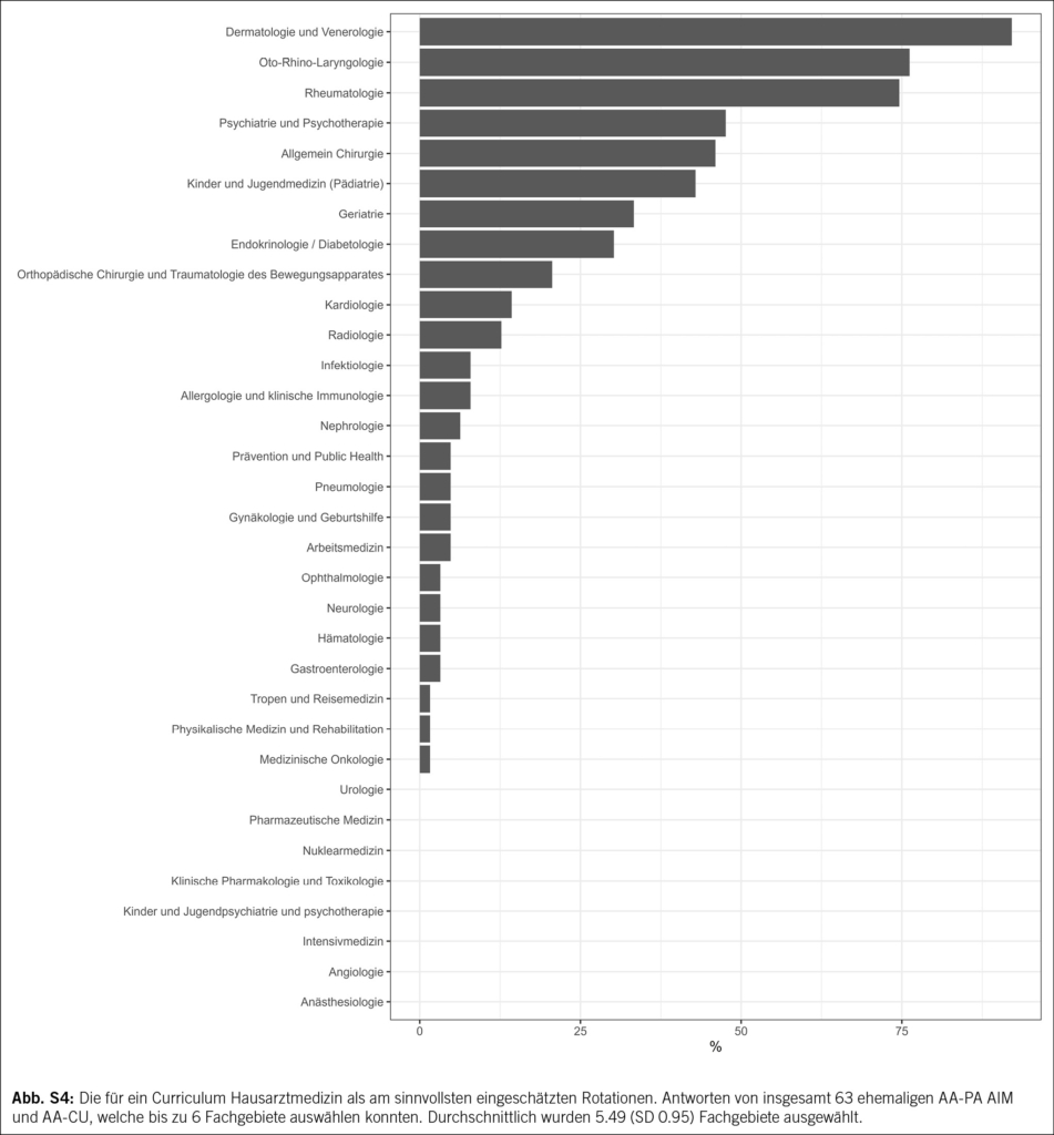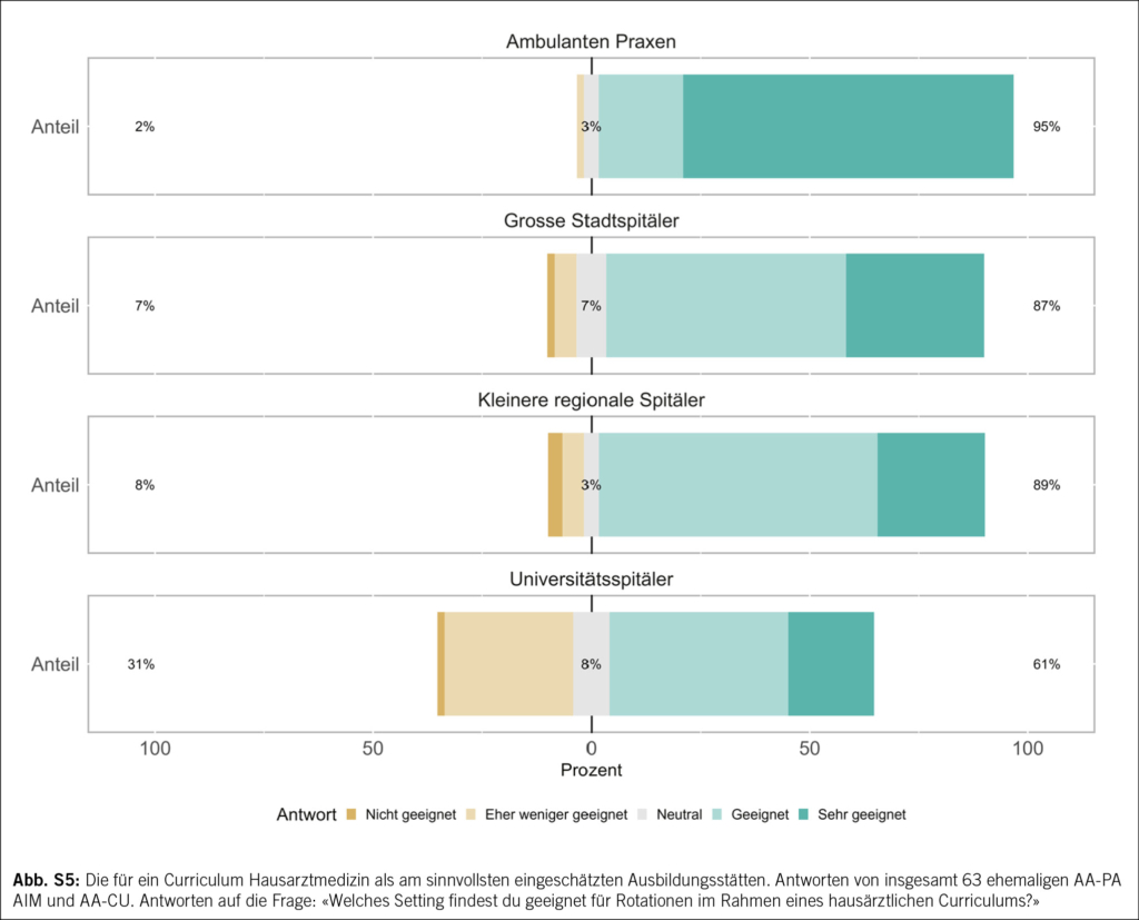 Insgesamt haben 21 (56.8 %) der 37 ehemaligen AA-PA AIM berichtet, dass sie gerne an einem Curriculum Hausarztmedizin teilgenommen hätten. Abb. S4 zeigt die für ein Curriculum am relevantesten beurteilten Rotationsstellen. Die Dermatologie, ORL, Rheumatologie und Psychiatrie wurden dabei als am relevantesten beurteilt. Ambulante Arztpraxen wurden von 95 % der Umfrageteilnehmer als die am ehesten geeigneten Ausbildungsstätten bewertet, wohingegen nur 61 % die Universitätsspitäler als geeignet betrachteten. Grössere und kleinere Spitäler wurden von 87 % bzw. 89 % als geeignet bewertet (Abb. S5).
