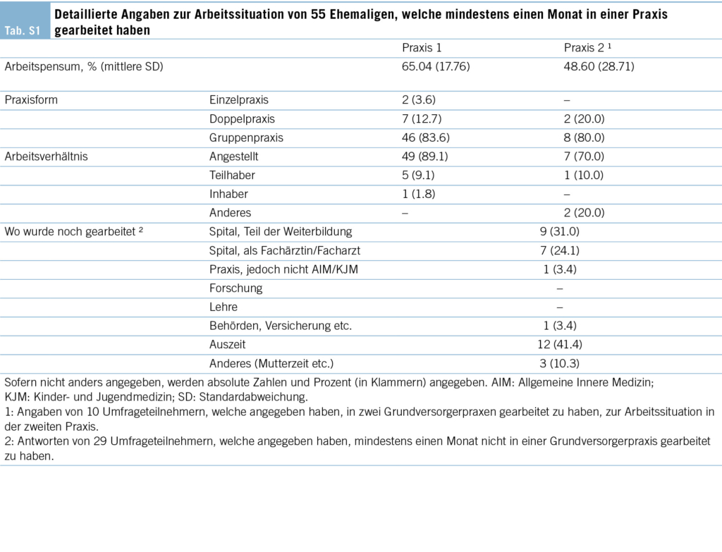 Für die Analyse wurden nur die Ergebnisse der vollständig ausgefüllten Fragebögen verwendet (complete case analysis). Die statistische Analyse erfolgte mit der Software R (Version 4.4.0) (7). Die Ergebnisse wurden deskriptiv als absolute Zahlen und Prozentsätze, N (%), für kategoriale oder binäre Variablen und als Mittelwert (Standardabweichung [SD]) für kontinuierliche Variablen dargestellt. Das kumulative Arbeitszeitpensum wurde aus dem Produkt von Anzahl Monaten und dem Arbeitspensum ermittelt (Stellenprozent).