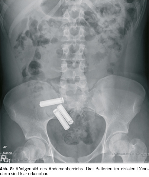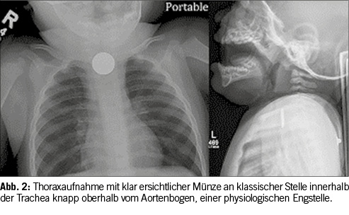 Jedoch gibt es auch hierbei einige Einschränkungen. Schlecht erkennbare Gegenstände, wie zum Beispiel kleine Fischgräten oder Hühnerknochen, sind im Körper häufig zusätzlich durch dichte Organe, oder Knochen verdeckt und bleiben somit dem Auge vorenthalten.[7] Es kommt vor, dass ein Gegenstand auf dem Referenzbild gut erkennbar ist, beim Patienten auf den Röntgenaufnahmen jedoch nicht. Es gibt neben den klinischen Symptomen wie zum Beispiel starke Speichelbildung, Übelkeit, Schluckbeschwerden oder Atemnot sowohl direkte als auch indirekte Befunde im Röntgenbild, welche auf einen Fremdkörper hinweisen. Direkte Hinweise sind auf Röntgenbildern einfach ersichtliche, röntgendichte Objekte, wie zum Beispiel Münzen oder Batterien (Abbildung 2). Falls der Fremdkörper nicht röntgendicht ist, können indirekte Befunde wie zum Beispiel eine fokale Obstruktion einer Darmschlinge, eine Verlagerung vom Mediastinum oder die fehlende ‘Luftsäule’ in einem Bronchus auf einen nicht röntgendichten Fremdkörper hinweisen.