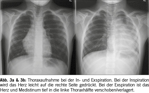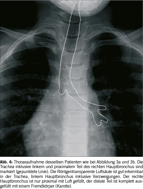 Die Trachea endet in einer achsensymetrischen Gablung, die in die Pulmo dexter und Pulmo sinister übergeht. Sowohl die Trachea als auch die Lungenflügel und das Herz sind auf Röntgenbildern zu erkennen. Auf Abbildung 3a & 3b ist jedoch kein röntgendichter Fremdkörper zu finden. Die indirekten Bildbefunde deuten jedoch auf einen nicht-röntgendichten Fremdkörper im rechten Hauptbronchus hin. Bei der Inspiration sind das Herz und Mediastinum knapp rechts der Mittellinie; während der Exspiration verschieben sich die mediastinalen Strukturen deutlich nach links, mehr als üblicherweise gesehen wird. Das deutet auf ein ‘Airtrapping’ in der rechten Lunge hin, während die linke Lunge eine normale Variabilität der Belüftung bei Inspiration und Exspiration zeigt. Ein zusätzliches indirektes Zeichen eines Fremdkörpers ist das Fehlen der Luftsäule im rechten Hauptbronchus. Bei der Endoskopie wurde ein Teil einer Karotte im distalen, rechten Hauptbronchus gefunden. Diese Karotte hat zudem zu einem progressiven Airtrapping in der rechten Lunge geführt mit progredienter Atemnot. Die Karotte hat über einen ‘Ball-Valve’ Mechanismus bei jedem Atemzug Luft in der rechten Lunge passieren lassen, beim Ausatmen konnte die Luft jedoch nicht entweichen. Diese Situation hätte progressiv zu einer lebensbedrohlichen Situation führen können. Zeitgerechte Erkennung von indirekten Bildbefunden sind dementsprechend von eminenter Wichtigkeit.[8]