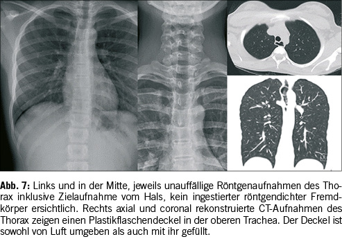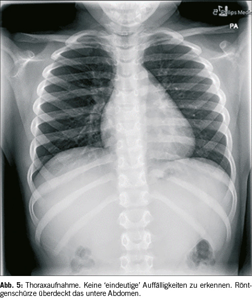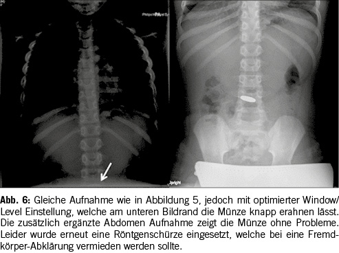Eine weitere Erklärung für ein unauffindbares Objekt mag banal klingen, ist in der Praxis aber eine immer wieder auftretende Problematik: ein zu kleiner oder ungenügender Untersuchungsbereich. Oft kommt es vor, dass lediglich Aufnahmen des Thorax und des Pharynx gemacht werden. Das mag eventuell bei erst kürzlich ingestierten Fremdkörpern ausreichend sein, handelt es sich jedoch um eine Ingestion, welche einige Stunden oder sogar Tage zurückliegt [9], so befindet der Fremdkörper sich eventuell bereits im Abdomen. Auf Abbildung 5 ist kein deutlicher Fremdkörper zu finden. Die Erklärung dafür ist simpel. Der Fremdkörper ist bereits weiter distal im Magen-Darm-Trakt und auf der Thorax-Aufnahme nur von geübtem Auge knapp am unteren Bildrand zu erkennen. Zudem ist die Münze partiell von der Röntgenschürze abgedeckt. Verschiebt man die Abdeckung, welche über der Pelvis liegt, etwas nach unten, wie in Abbildung 5 geschehen, so wird eine Münze sichtbar. Dieser Fall illustriert eindeutig, dass bei Röntgenaufnahmen zur Lokalisierung von Fremdkörpern immer vom Rachen bis zum Anus untersucht werden sollte. Es ist dringend zu empfehlen eine Aufnahme des ganzen Thorax, des Pharynx, des Abdomenbereichs und der Pelvis zu machen. Eventuell ist auch noch eine seitliche Aufnahme des Thorax notwendig, um den Gegenstand zu erkennen. Ein Röntgenbild ist jedoch nicht bei jedem Gegenstand ausreichend. Bei auf Röntgenaufnahmen nicht erkennbaren Fremdkörpern, kann ein CT (Computed Tomography) aufschlussreich sein, da auf dem Querschnitt der zu untersuchenden Körperregion das Objekt besser erkannt werden kann.