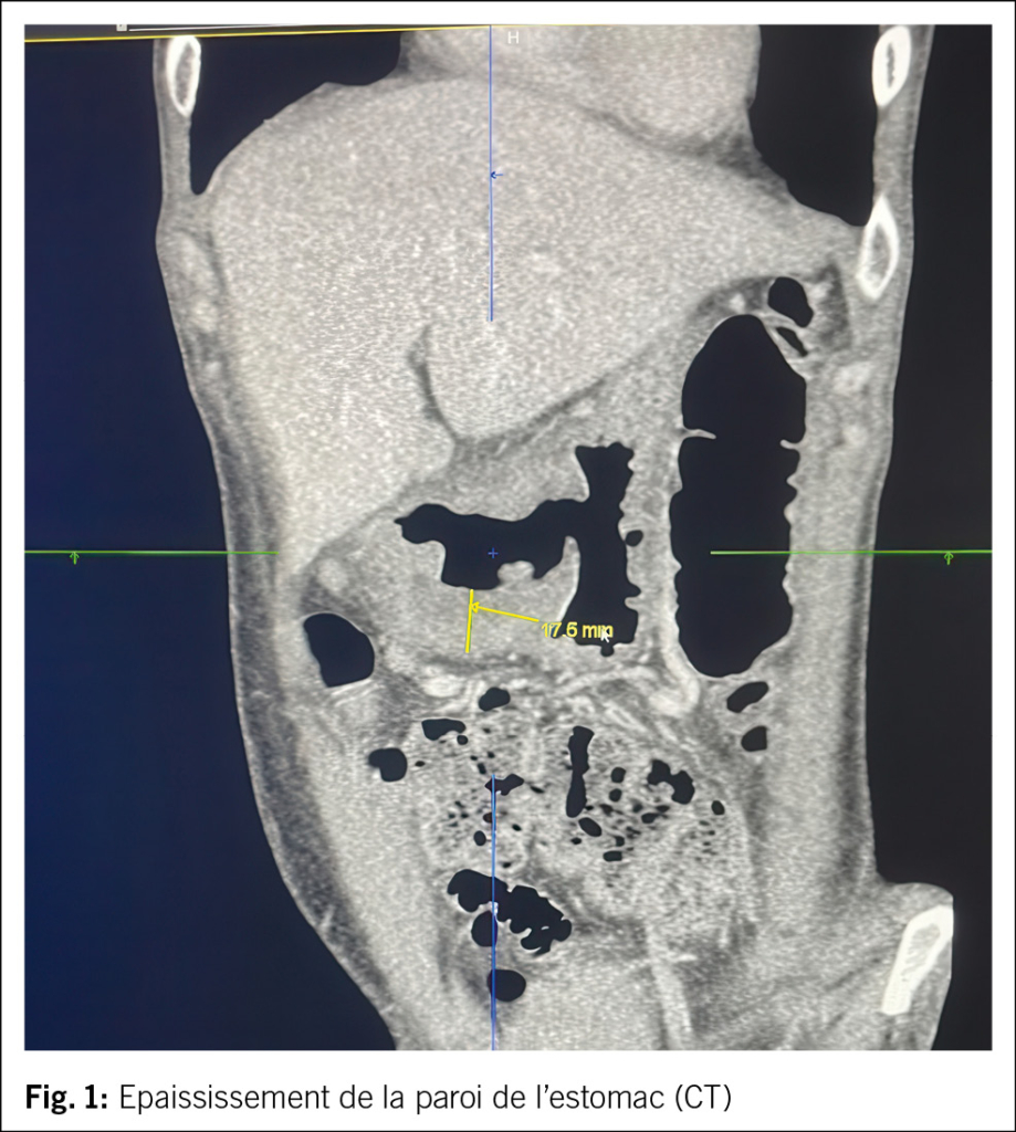 Un mois auparavant, une OGD à l’extérieur avait mis en évidence une pangastrite, Hélicobacter pylori positif et un grand ulcère (Forrest IIc) s’étendant entre le bulbe duodénal et l’antre de l’estomac. Un traitement par Pyléra 3-3-3 pour 10 jours avait été instauré, accompagné par Pantoprazole pour un mois. Une OGD de contrôle deux mois plus tard montra une légère régression de l’ulcère. Des biopsies révélèrent une négativité pour Hélicobacter pylori sans signes de dysplasie ni de malignité. Le test à l’uréase revenait négatif. Pour écarter un syndrome de Zollinger-Ellison, la gastrine fut dosée donnant une valeur de 99.6 (< 150) pmol/l, soit dans la norme ; et pour écarter une tumeur neuro-endocrinienne, la chromogranine A se trouva légèrement élevée à 238 (< 94) ug/l. Par la suite, la patiente était hospitalisée plusieurs fois pour des épigastralgies et vomissements. Son hémoglobine était normale et stable avec des valeurs > 160 g/l. Le laboratoire montrait une légère hypokaliémie (3.3 mmol/l) et une légère perturbation des tests hépatiques (ASAT 73 U/l, ALAT 83 U/l) sans choléstase ni syndrome inflammatoire. Un CT thoraco-abdominal n’a montré qu’un épaississement pariétal modéré de l’estomac, mais pas d’autres pathologies. Des traitements par Pantoprazole i.v. et p.o. ont été poursuivis. Parallèlement, un traitement nutritif (2 x Fresubin/jour) a été prescrit. À noter dans l’anamnèse de patiente aussi des antécédents de troubles de l’adaptation avec des symptômes anxio-dépressifs et des troubles alimentaires à l’âge de 20 ans. Un accompagnement psychiatrique incl. médication par Mirtazapine 15 mg/jour fut établi.