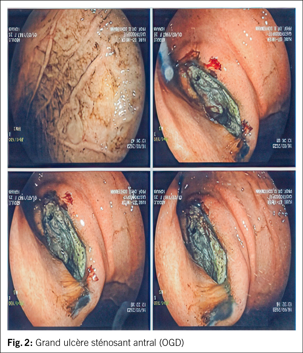 À la dernière hospitalisation, 4 mois après la 2ième OGD, elle ne pesait qu’encore 41 kg, mais cette fois aussi son Hb est à la baisse avec une valeur initiale de 108 g/l, le lendemain même à 96 g/l. De plus, nous trouvons un syndrome inflammatoire avec une leucocytose à 27.7 g/l et une CRP à 59 mg/l. En plus des épigastralgies, nous constatons aussi des ganglions axillaires et inguinaux, indolores. Un 2ème scanner abdominal montre toujours un épaississement pariétal de la partie basse de l’estomac et de la région du pylore (Fig. 1). Une sérologie virale et un test quantiferon reviennent négatifs. Une 3ième gastroscopie sous intubation protective (risque de broncho-aspiration) montre une grande ulcération antrale et intra-pylorique (Fig. 2), sténosante, très suspecte d’une néoplasie, ainsi que des signes d’une hémorragie digestive haute avec 350 ml d’hématine dans l’estomac. Des biopsies sont prélevées.