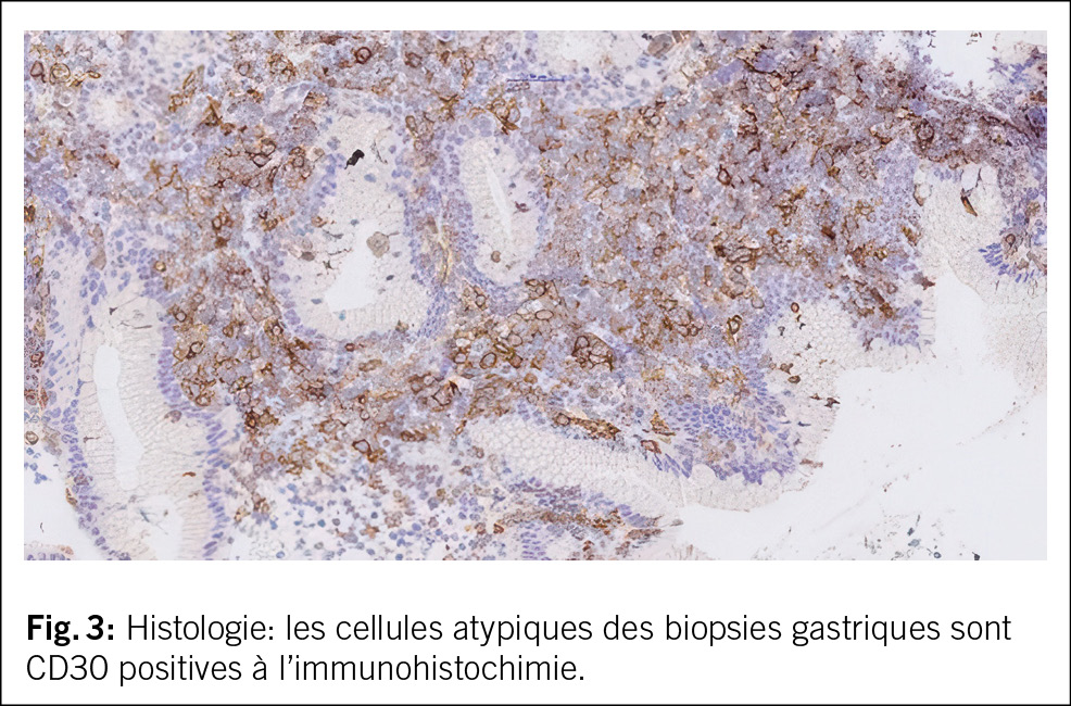 Lymphome (MALT gastrique) a cellules T, ALK négatif, CD30 positif. (Fig. 3)
