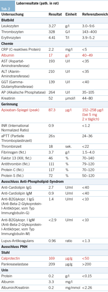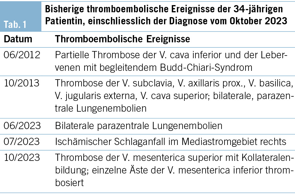 Die 34-jährige Patientin Schweizer Herkunft wurde uns wegen eines subakuten thrombotischen Verschlusses der Vena mesenterica superior per Zufallsbefund in einer Computertomographie (CT) des Abdomens zugewiesen. Aufgrund bereits stattgehabter thromboembolischer Ereignisse nahm sie seit Juni 2023 regelmässig Apixaban (5 mg zweimal täglich) ein. Grund für die externe CT war eine ödematös-imponierende Darmschleimhaut des Kolons ohne Zeichen einer Blutung oder Entzündung in einer externen Koloskopie. Letztere wurde wegen seit Juli 2023 akut aufgetretener abdominaler Beschwerden und postprandialer Diarrhö durchgeführt. Ein Morbus Crohn (CD) mit Erstdiagnose vor über zehn Jahren stand in den Vordiagnosen. Bei bislang fehlender Klinik war bisher keine spezifische Crohn-Therapie etabliert. Der Befund einer zeitgleich erfolgten Gastroskopie war ebenso bland. Eine Zöliakie konnte hierbei histologisch ausgeschlossen werden. Laut Aufzeichnungen erlitt die Patientin mehrere unprovozierte, thromboembolische Ereignisse (Tab. 1). Daraufhin wurde eine Antikoagulation mit einem Vitamin-K-Antagonisten (Marcoumar©) etabliert, mit Umstellung auf Dalteparin (Fragmin©) während der Schwangerschaft. Nach der Geburt im Oktober 2022 setzte die Patientin die Antikoagulation ab, worauf dies im Juni 2023 zu einer Lungenembolie führte.