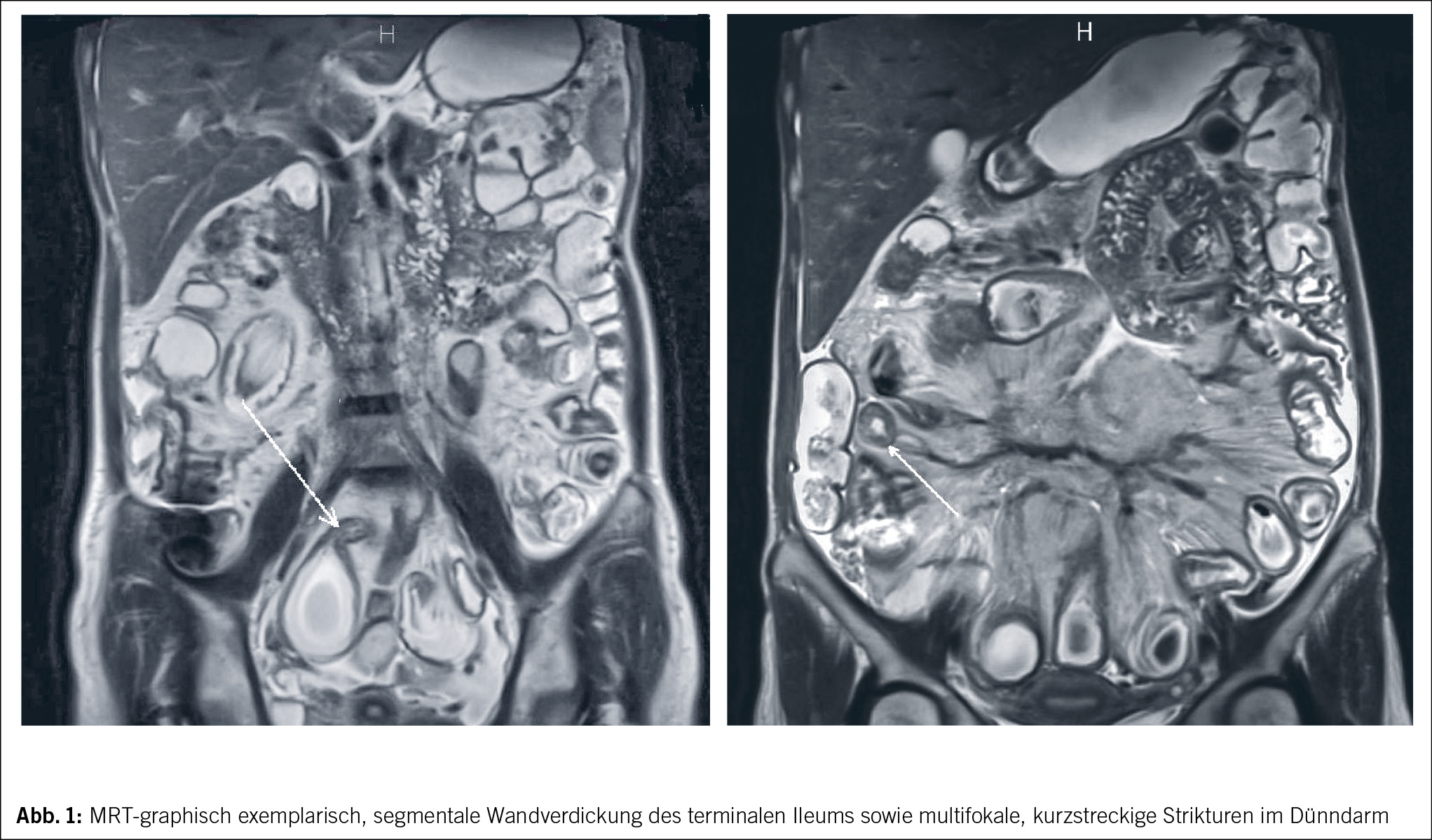 Eine Magnetresonanztomographie (MRT) des Dünndarms (Abb. 1) zeigte eine ausgeprägte segmentale Wandverdickung des terminalen Ileums sowie multifokale Strikturen im Dünndarm mit zuvor erweiterten Schlingen – vereinbar mit einem Morbus Crohn. Generell weist das Vorliegen eines intramuralen Ödems auf eine aktive Entzündung hin, während ein Nachweis von intramuralem Fett auf eine vergangene oder chronische Entzündung deutet (4). Eine Differenzierung zwischen aktiver Entzündung und venöser Kongestion – bei stattgehabtem Verschluss der Vena mesenterica superior – war letztlich bildgebend und als Rückschluss für die Wandverdickung nicht möglich. Eine mesenteriale Lymphadenopathie wurde ebenso beschrieben, passend zu einer entzündlichen Aktivität (4). Hinweise für Malignität gab es erneut keine. Eine Kapselendoskopie zur weiteren bildgebenden Abklärung wurde diskutiert. Aufgrund der vorliegenden Darmstrikturen verzichteten wir hierauf. Wegen der PLE und den ätiologisch unklaren Thrombosen bestimmten wir den Apixaban-Spitzenspiegel drei Stunden nach oraler Einnahme. Dieser lag mit 87.3 µg/l im subtherapeutischen Bereich (Referenzbereich 152–258 µg/l bei 5 mg Apixaban zweimal täglich). Unsere Vermutung einer enteralen Malabsorption bei CD verfestigte sich hierdurch. Insbesondere das kürzlich aufgetretene Ereignis (Verschluss der Vena mesenterica superior) trotz direkter oraler Antikoagulanzien (DOAK) könnte somit erklärt werden. Erschwerend dazu könne eine bereits zuvor bestehende postthrombotische Veränderung im Rahmen der Vena cava inferior Thrombose von 2012 als Risikofaktor nicht ausgeschlossen werden.