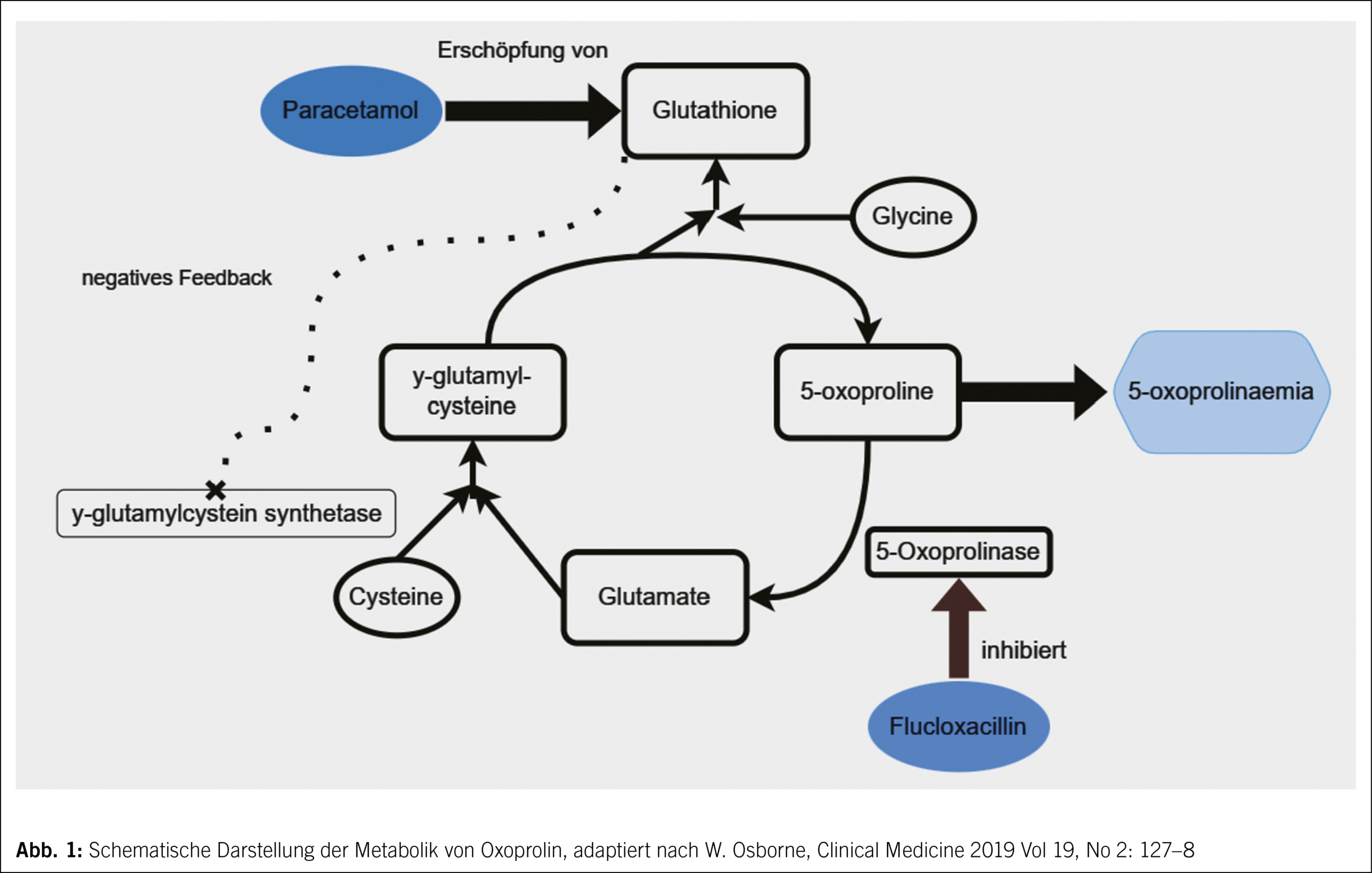 Im Gamma-Glutamyl-Zyklus kann 5-Oxoprolin durch die 5-Oxoprolinase zu Glutamat umgewandelt werden. Glutamat und Cystein bilden gemeinsam γ-Glutamylcystein, aus dem Glutathion und 5-Oxoprolin gebildet werden. Paracetamol verursacht einen Verbrauch von Glutathion durch seinen Metaboliten N-Acetylpbenzoquinonimin (3). Niedrige Glutathionspiegel lösen wiederum durch einen Rückkopplungsmechanismus einen Anstieg von γ-Glutamylcystein aus. Flucloxacillin hemmt die 5-Oxoprolinase (4). Dies führt zu einem Anstieg des 5-Oxoprolin-Spiegels und somit zu einer 5-Oxoprolinämie (Grafik 1). Das Risiko eines Gluthationmangels steigt bei Mangelernährung, Alkoholüberkonsum, fortgeschrittenem Alter sowie chronischen Erkrankungen.