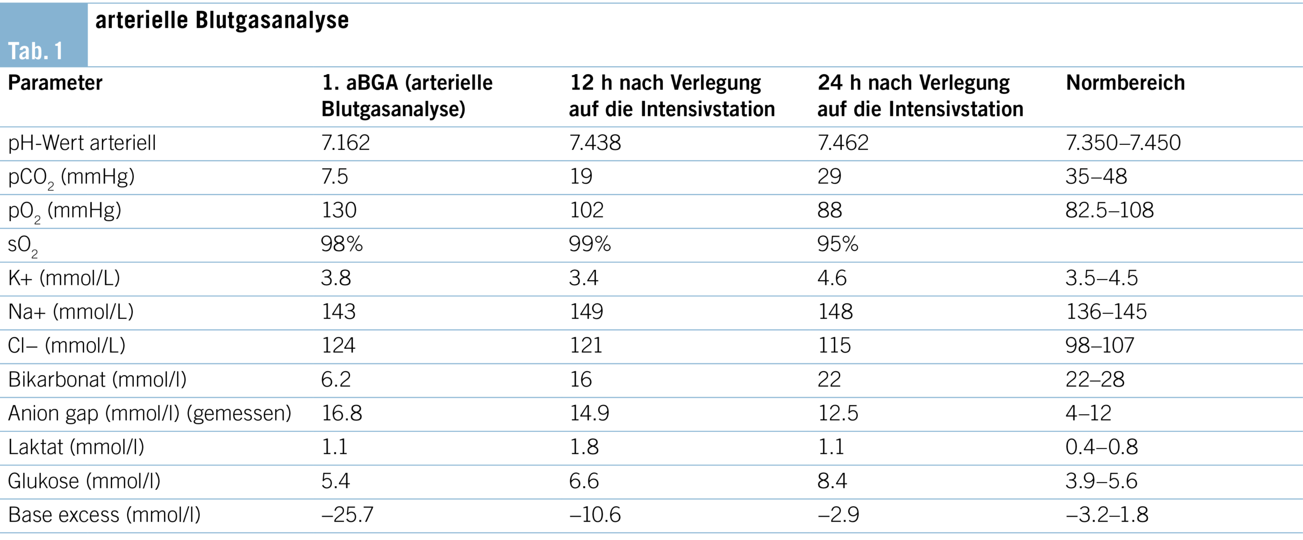 Die starken Schmerzen behandelten wir mit Metamizol (4x500mg p.o. täglich), Paraceta-mol (4×500 mg p.o. täglich), Oxycodon und Ketamin. Drei Wochen nach der Aufnahme präsentierte sich der Patient mit akut aufgetretener Tachypnoe (Atemfrequenz >40/min), Sprechdyspnoe jedoch normalem Lungenauskultationsbefund. Die periphere Sättigung unter Raumluft war normal. Es gab keine Marmorierung der Haut, der Patient war hämo-dynamisch stabil (Blutdruck 170/95 mmHg, Herzfrequenz 112/min., rhythmisch), afebril (37 °C), die Halsvenen waren nicht gestaut, periphere Ödeme bestanden nicht. Die Darm-geräusche waren über allen vier Quadranten normal, der Bauch war weich und ohne Druckempfindlichkeit. Das EKG (Elektrokardiogramm) und die Laboruntersuchungen zeig-ten keine Anzeichen eines akuten Koronarsyndroms. Die Blutgasanalyse zeigte eine schwere metabolische Azidose (pH 7,162, pCO2 7.5 mmHg) mit erhöhter Anionenlücke (16,8 mmol/l), erniedrigtem Bikarbonat (6 mmol/L), normalem Laktat (1,1 mmol/l) und normalem Blutzucker (Tab. 1).