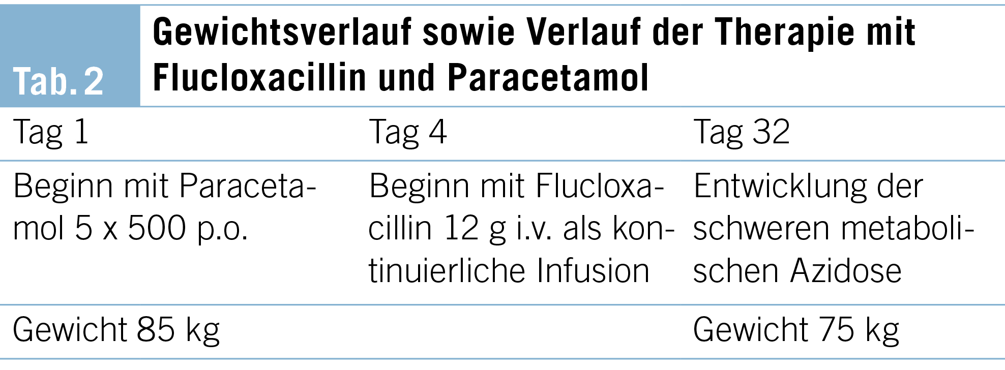 Bei dem Patienten lag eine schwere akute metabolische Azidose vor. Eine Laktatazidose lag nicht vor und die Nierenfunktion war normal (Messung der Cystatin C Clearance). Der Blutzucker war nicht entgleist, Ketonkörper konnten initial im Urin (mittels Streifentest) nicht nachgewiesen werden. Aufgrund der gleichzeitigen Therapie mit Flucloxacillin und Paracetamol bei einem Patienten in einem mangelernährten Zustand (Gewichtsabnahme von 10 kg im letzten Monat) wurde eine Akkumulation von 5-Oxoprolin vermutet.