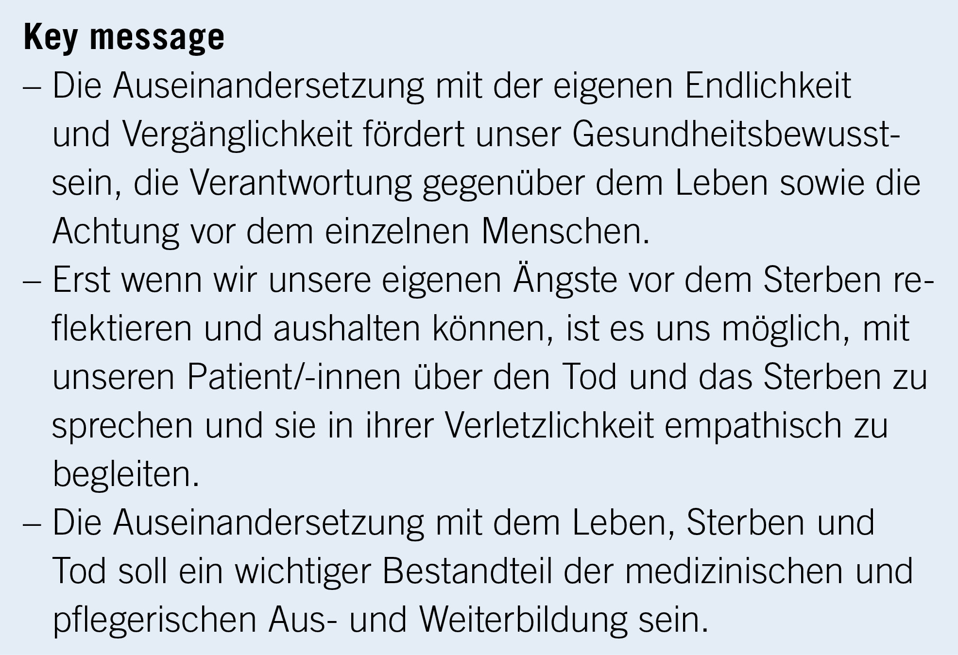 Die Auseinandersetzung mit der Endlichkeit und der Vergänglichkeit in der Arbeit mit Patient/-innen ist sehr anspruchsvoll. Sie erfordert neben einer hohen sozialen Kompetenz eine vertiefte Selbstreflexion, Kenntnisse von Kommunikationstechniken sowie eine fundierte Schulung und Sensibilisierung bezüglich Fragen hinsichtlich Leben, Sterben, Tod, Verlust und Trauer. Diese Kenntnisse können erlernt werden, werden aber in der medizinischen und pflegerischen Aus-, Weiter- und Fortbildung nach wie vor zu wenig berücksichtigt.