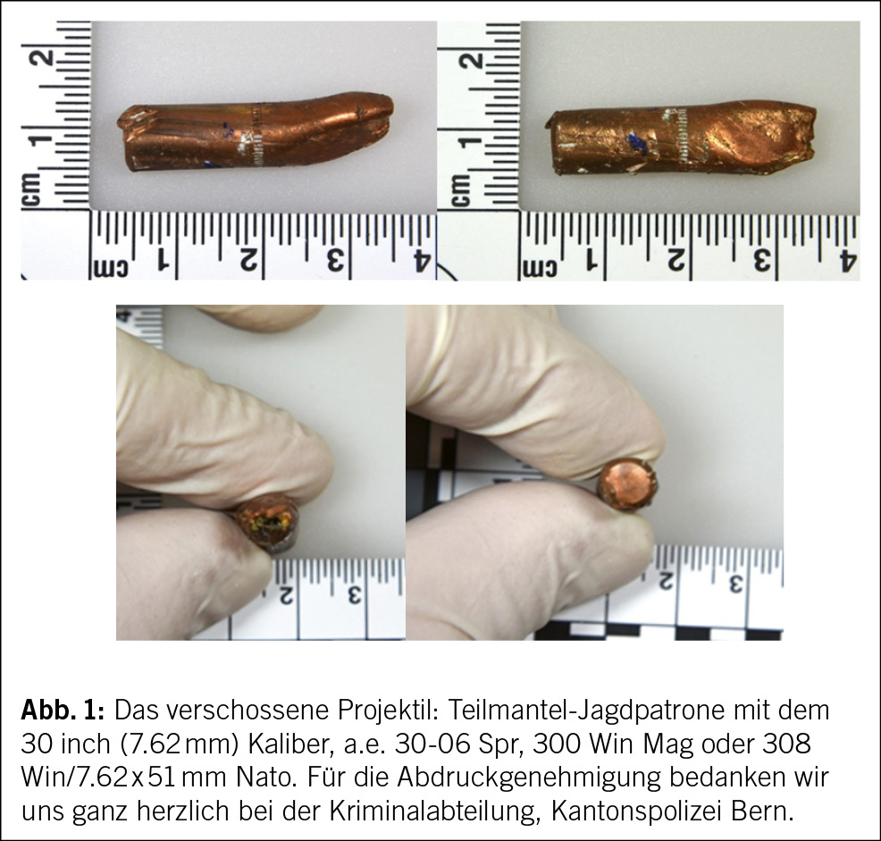 An einem Herbstabend zerbrach ein Projektil das Badezimmerfenster des Einfamilienhauses einer 71-jährigen Frau. Glücklicherweise wurde niemand verletzt. Der Schrecken sass jedoch tief, und die Polizei wurde sofort alarmiert. Im Badezimmer wurde ein Teilmantelgeschoss Kaliber .30 (7.62 mm) aufgefunden (Abb. 1). Mit hoher Wahrscheinlichkeit stammt das Projektil von einer Jagdpatrone. Ermittlungen gegen Unbekannt wurden wegen Gefährdung des Lebens und Sachbeschädigung aufgenommen.