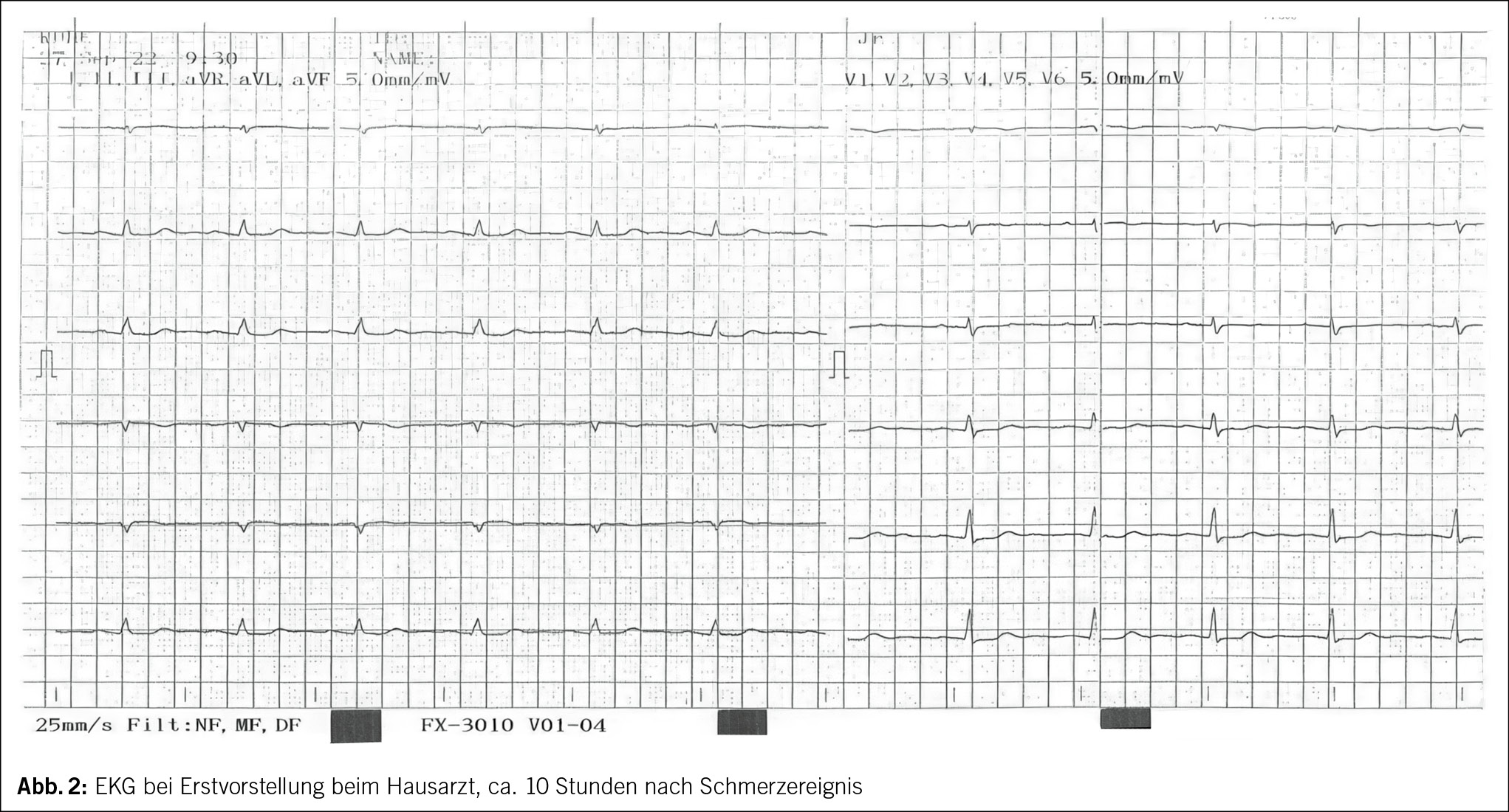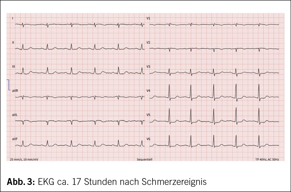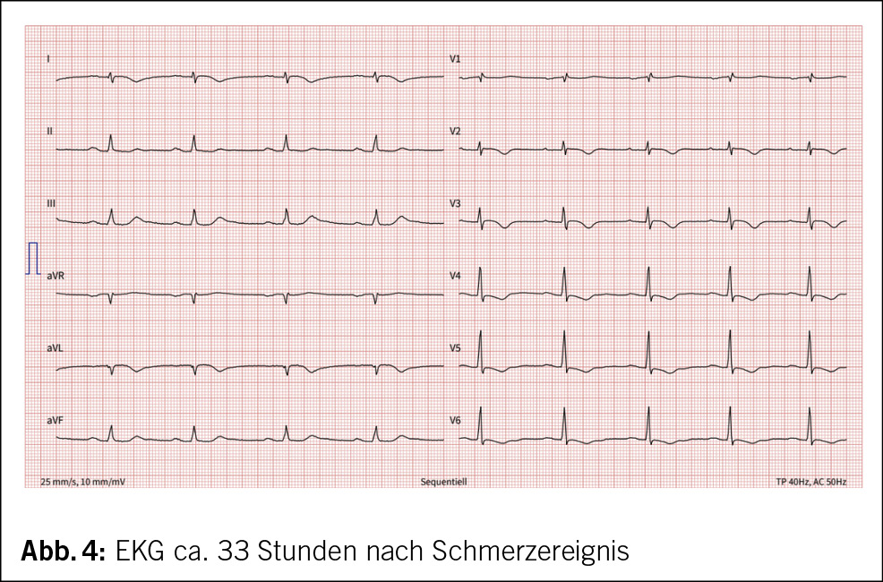 Etwa eine Stunde nach dem Ereignis verspürte die 71-jährige Frau starke Schmerzen in der Brust und zwischen den Schulterblättern, welche nach 1–2 Stunden spontan rückgängig waren. Am Folgetag suchte die Patientin ihren Hausarzt auf, wo ein erhöhtes Troponin Tn-I und anterolaterale sowie inferiore Repolarisationsstörungen mit ST-Senkungen, T-Abflachungen und -Negativierungen im EKG festgestellt wurden (Abb. 2–4).
