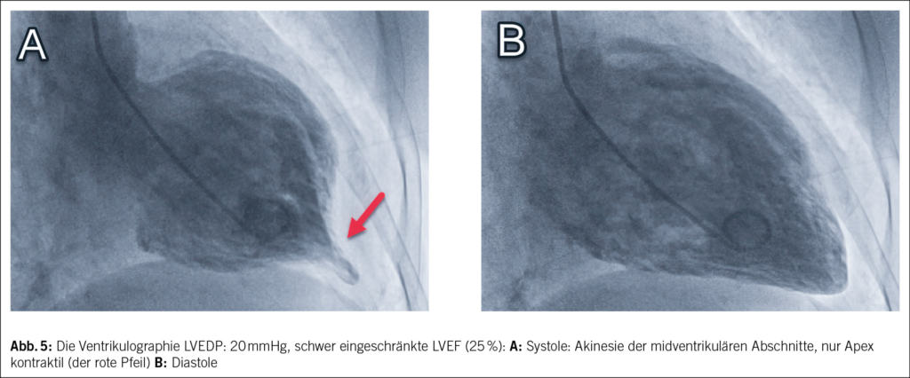 Bei Verdacht auf Myokardinfarkt wurde die Patientin ins regionale Krankenhaus eingewiesen und anschliessend zur Herzkatheteruntersuchung ins Zentrumsspital verlegt. Eine koronare Herzkrankheit konnte ausgeschlossen werden, jedoch zeigte die Ventrikulographie bei einem erhöhten linksventrikulären enddiastolischen Druck vom 20 mmHg (Norm < 15 mmHg) eine schwer eingeschränkte systolische linksventrikuläre Ejektionsfraktion (LVEF) von 25 % (Norm > 55 %) mit Akinesie der midventrikulären Abschnitte (Abb. 5).