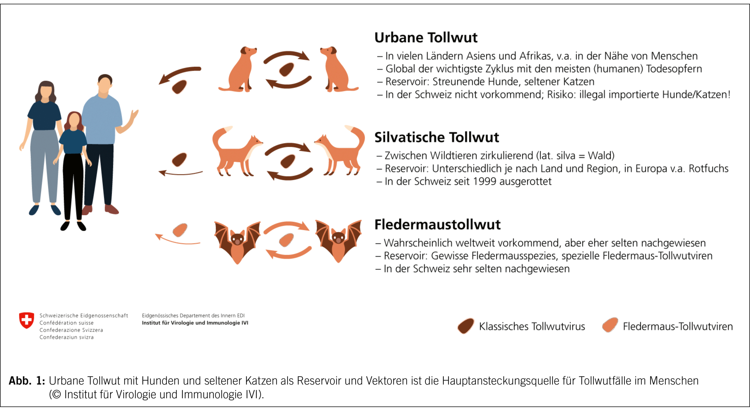 Für das Infektionsrisiko des Menschen sind die Reservoirtiere, in denen das Tollwutvirus zirkuliert, von Bedeutung (Abb. 1) (5): Die urbane Tollwut ist weltweit aufgrund der Nähe der Hunde zum Menschen für die allermeisten humanen Tollwutfälle verantwortlich. Obwohl sie in der Schweiz nicht mehr vorkommt, besteht das Risiko einer Einschleppung durch illegal importierte Tiere. Die silvatische Tollwut, welche in Wildtieren zirkuliert, fand in der Schweiz vor allem im Rotfuchs ein Reservoir und konnte durch Massenimpfaktionen ausgerottet werden. Diese beiden Übertragungszyklen werden zusammen als terrestrische Tollwut bezeichnet. Die Schweiz wurde 1999 als offiziell frei von terrestrischer Tollwut erklärt (6). Lediglich die Fledermaustollwut ist in der Schweiz noch selten zu finden. Seit 1992 wurde das Tollwutvirus bei insgesamt sechs Fledermäusen nachgewiesen, letztmals im September 2024 im Kanton Glarus (7).