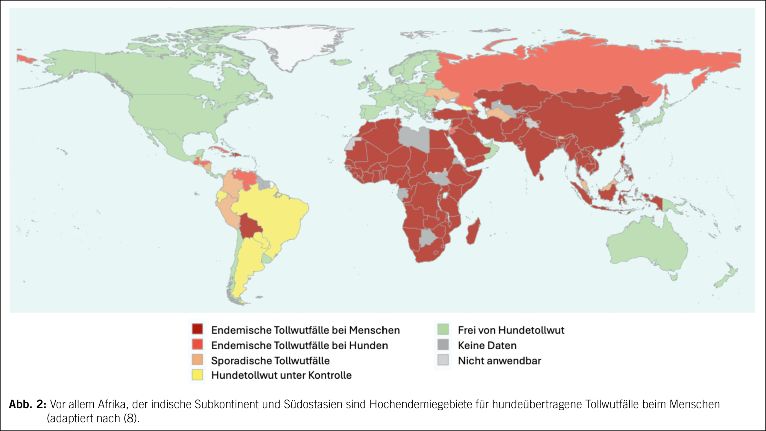 Tollwut kommt auf allen Kontinenten, ausser in der Antarktis, vor. Für die Abschätzung des Infektionsrisikos des Menschen ist aber primär die geografische Verbreitung der urbanen Tollwut relevant (Abb. 2) (8). Besonders der afrikanische Kontinent, der indische Subkontinent, Südostasien und Bolivien weisen endemisch humane Tollwutfälle auf, während Westeuropa und Nordamerika frei von urbaner Tollwut sind.