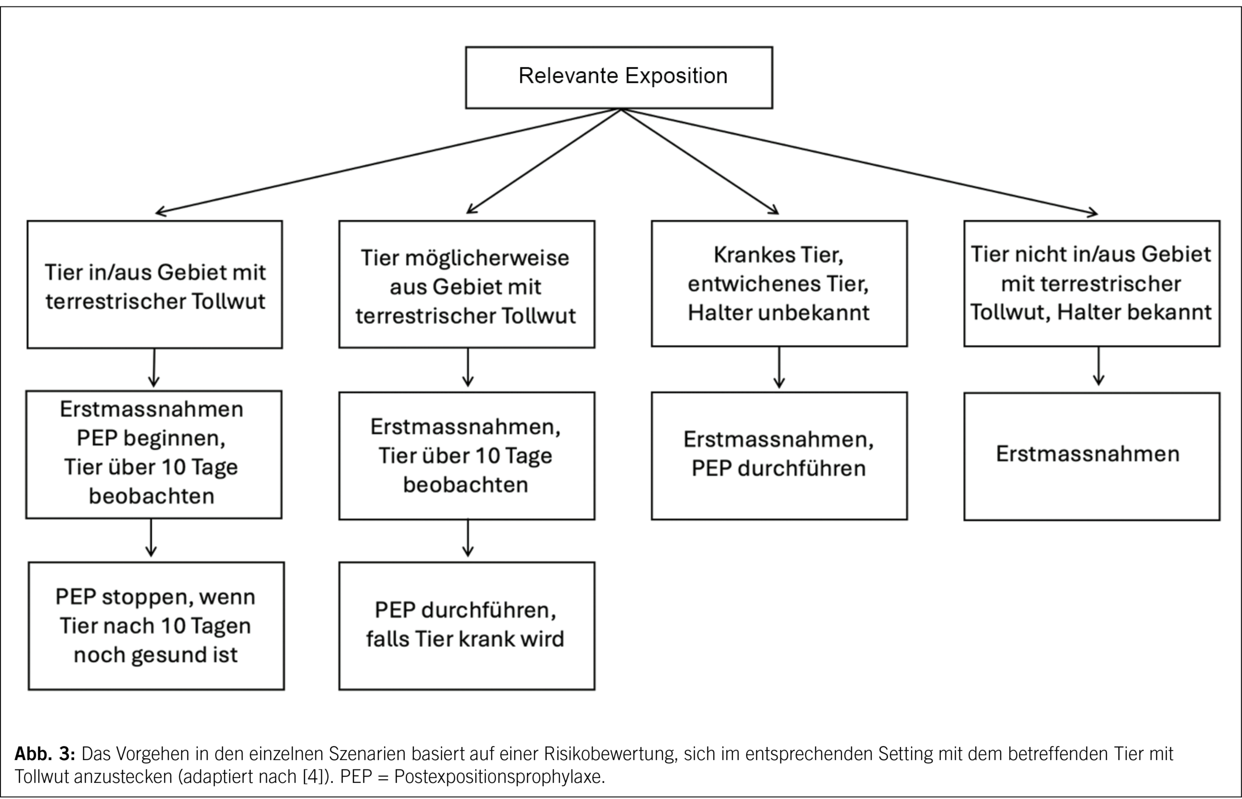 Das Vorgehen nach Exposition wird gemäss einer Risikobeurteilung festgelegt (Abb. 3) (4). Erfolgt die Exposition in einer Region mit Tollwutrisiko oder stammt das Tier aus einem enzootischen Gebiet, sollte unverzüglich eine PEP begonnen werden. Wenn nach Exposition die Möglichkeit besteht, das Tier über einen Zeitraum von 10 Tagen zu beobachten, und anschliessend durch einen Tierarzt bestätigt werden kann, dass dieses immer noch gesund ist, kann auf die letzte Impfdosis und die Titerkontrolle verzichtet werden. Im Zweifelsfall soll eine PEP begonnen werden, wenn initial nicht alle Informationen vorliegen. Die begonnene PEP kann immer abgebrochen werden, wenn im Verlauf eine potenzielle Tollwutexposition ausgeschlossen werden kann.