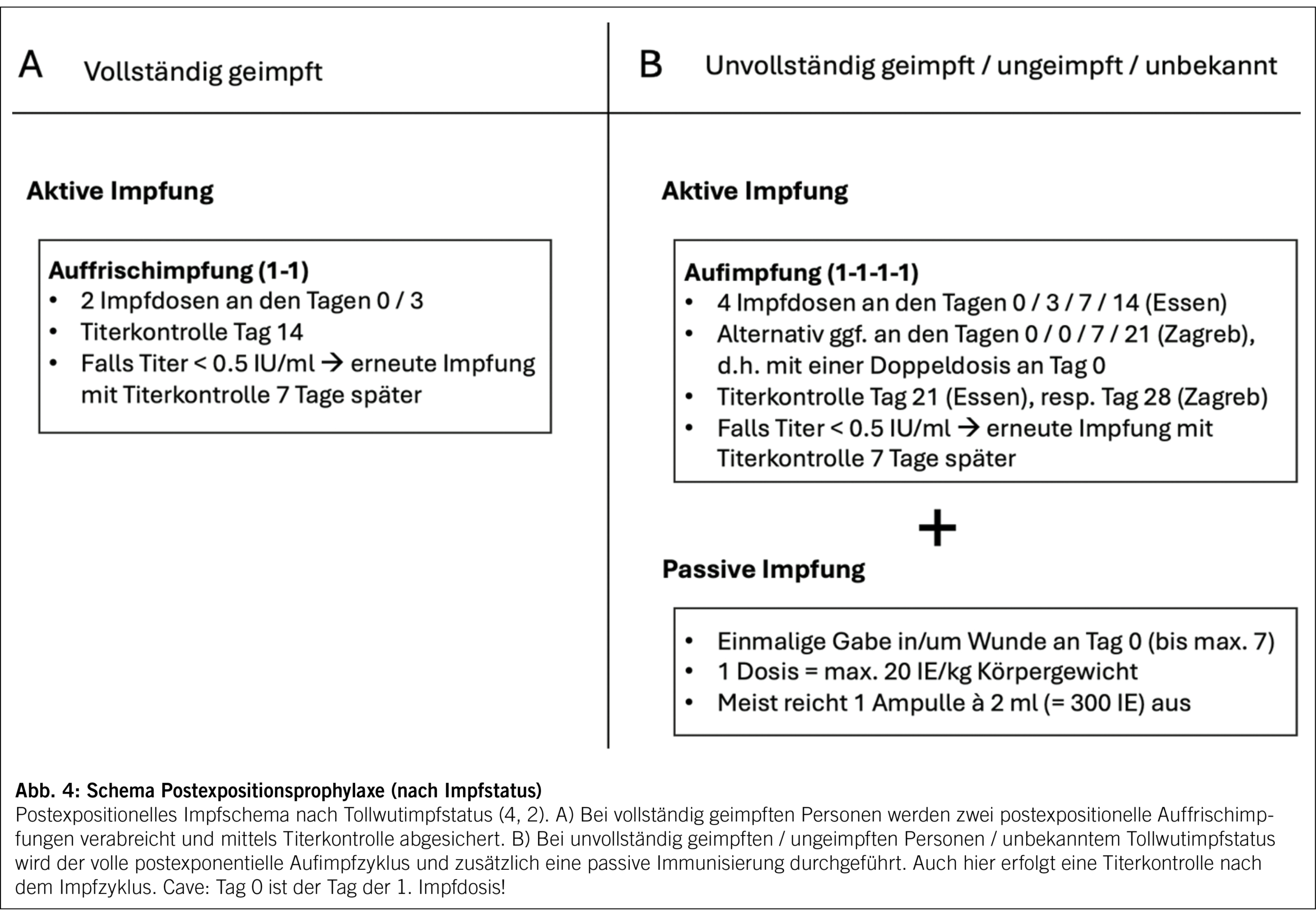 Personen, die nicht oder unvollständig geimpft wurden (< 2 Impfdosen) oder deren Tollwutimpfstatus unbekannt ist, brauchen einen kompletten PEP-Impfzyklus (Abb. 4 B). Es werden 4 Einzeldosen (Tage 0/3/7/14) verabreicht und eine Titerkontrolle an Tag 21 durchgeführt (Impfschema Essen). Teilweise werden auch alternative PEP-Impfintervalle angewendet, wie beispielsweise das Impfschema Zagreb mit 1 Doppeldosis und 2 Einzeldosen (Tage 0/0/7/21) und Titerkontrolle an Tag 28 (alternativ Titerkontrolle bereits an Tag 21, gleichzeitig mit der 4. Impfdosis, um bei bereits ausreichendem Titer eine zusätzliche Konsultation zu sparen). Zusätzlich wird mit der ersten Aktivimpfung einmalig eine passive Immunisierung mit humanen Immunglobulinen empfohlen, die um die Wunde injiziert wird. Die Dosierung (maximal 20 IE/kg Körpergewicht) soll den anatomischen Gegebenheiten der Läsion angepasst werden. Eine Ampulle à 300 IE (2 ml) reicht auch bei Körpergewicht > 15 kg meist aus, ausser es handelt sich um sehr ausgedehnte oder multiple Verletzungen. Eine intramuskuläre Gabe von (allfällig verbleibenden) Immunglobulinen ist – ausser bei direkter Fledermaus- oder Schleimhautexposition – nicht indiziert, da dies den Schutz nur geringfügig erhöht (3). Wenn die Immunglobuline bei Impfbeginn nicht verfügbar sind, kann die Gabe bis zu 7 Tagen nachgeholt werden. Eine spätere Verabreichung ist nicht indiziert, zumal dies mit der durch die Aktivimpfung induzierten Antikörperbildung interferieren könnte (3, 4). Wurde im Rahmen eines früheren unvollständigen PrEP-Impfzyklus bereits einmalig eine Aktivimpfung verabreicht, braucht es einen kompletten aktiven PEP-Impfzyklus inklusive Immunglobulingabe.