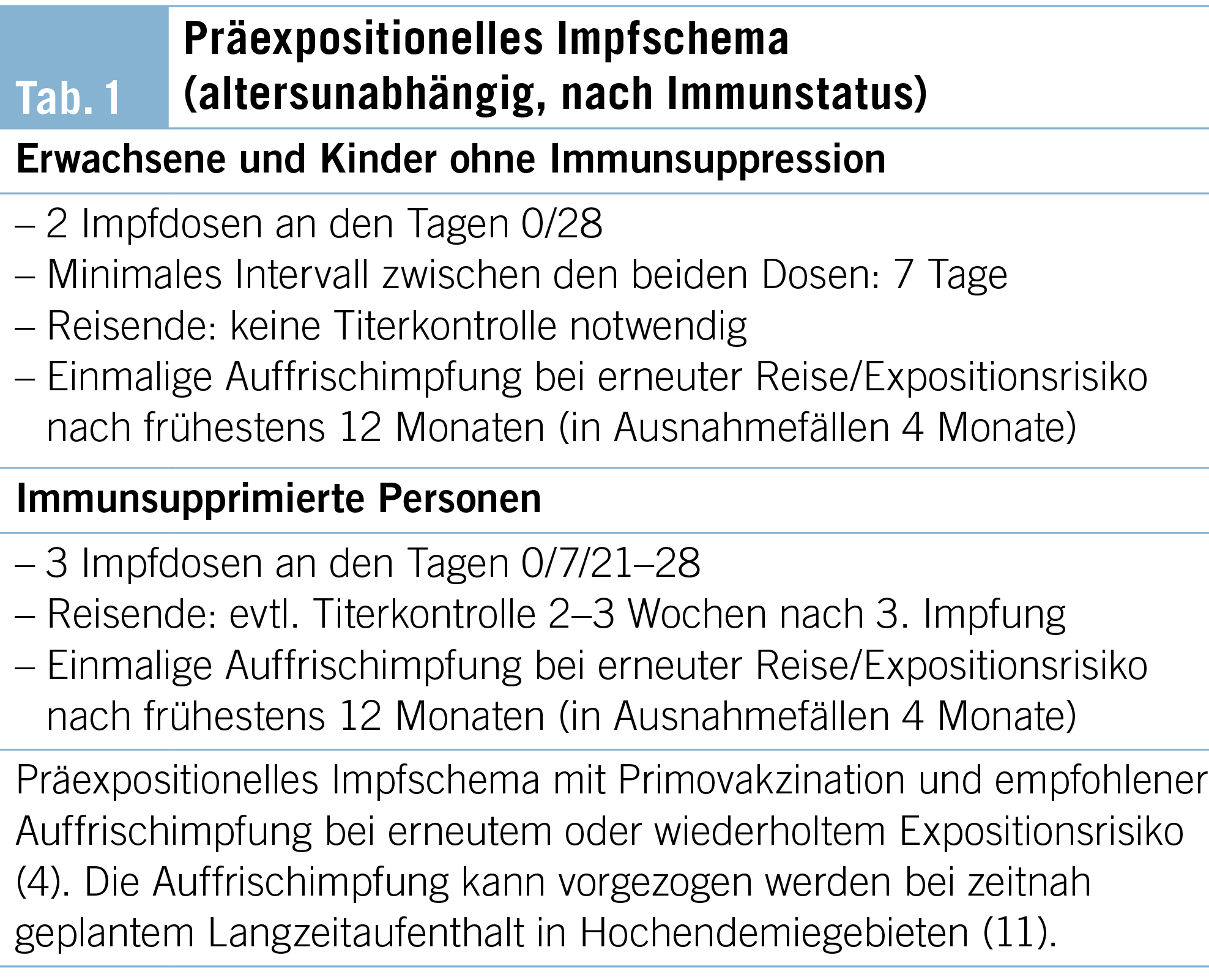 Da der Impfstoff altersunabhängig als hocheffektiv gilt und es praktisch kein Impfversagen gibt, braucht es keine routinemässigen Titerkontrollen (ausser bei beruflich exponierten und allenfalls bei immunsupprimierten Personen) (4). Für Reisende wird empfohlen, die Primovakzination spätestens 2 Wochen vor Abreise abzuschliessen, um mit vollem Impfschutz zu reisen. Bei Personen, die in < 7 Tagen verreisen oder aus anderen Gründen vor Abreise nicht die vollständige PrEP erhalten, kann die PrEP begonnen und zu einem späteren Zeitpunkt oder eventuell auch im Ausland abgeschlossen werden. Bereits eine erste Dosis führt zu einer guten Boosterantwort auf eine erneute Impfung im Rahmen einer Postexpositionsprophylaxe (10). Dennoch ist hier bei einer Exposition eine vollständige Postexpositionsprophylaxe indiziert (2).