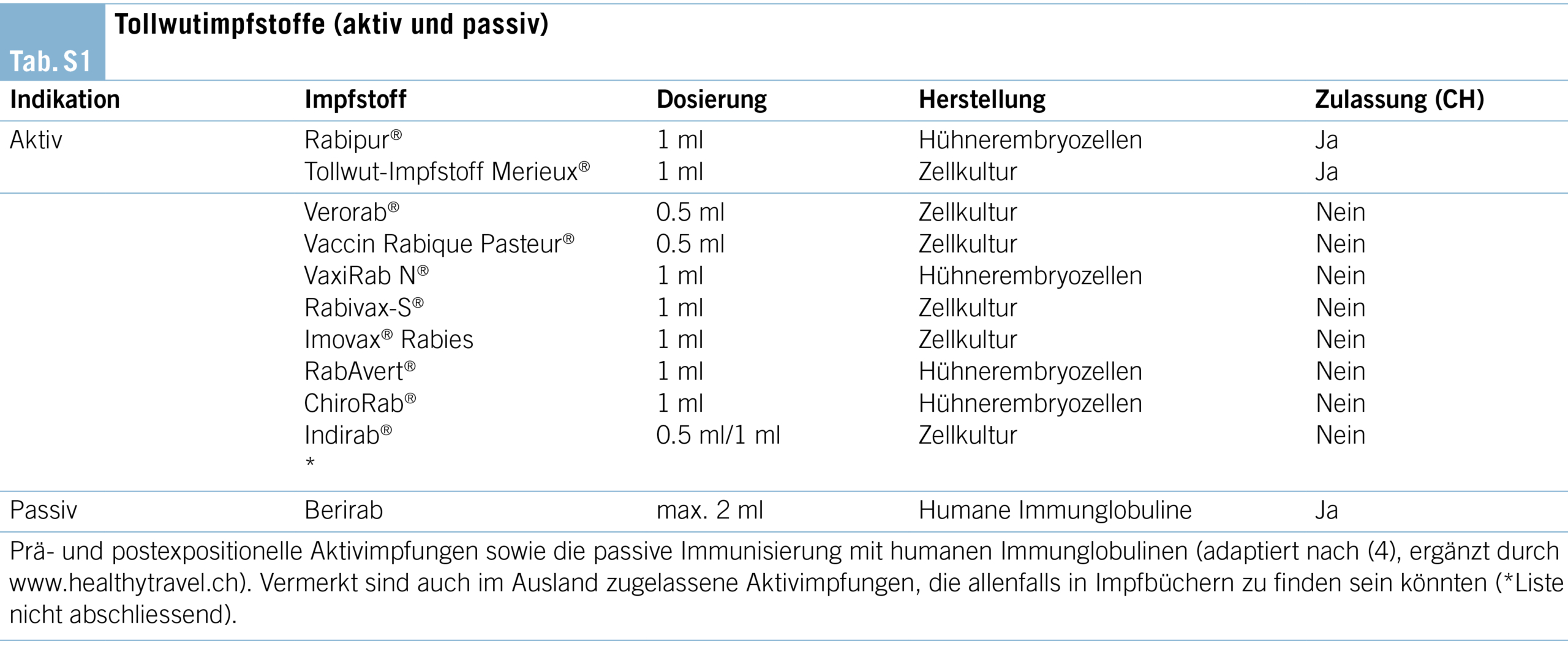 In der Schweiz sind zwei aktive Totimpfstoffe für die Prä- und Postexpositionsprophylaxe zugelassen: Rabipur® und Tollwut-Impfstoff Mérieux® (Tab. S1). Sie sind bezüglich Antigenmenge und Dosierung vergleichbar und somit bei Bedarf austauschbar (4). Es gibt aber auch eine Vielzahl von in anderen Ländern verwendeten Tollwutimpfstoffen, welche in der Praxis in Impfausweisen bei im Ausland durchgeführten Impfungen zu finden sind. Wenn solche Impfstoffe den WHO-Anforderungen für humane Tollwutimpfstoffe entsprechen (3), können begonnene Impfserien in der Regel mit den in der Schweiz verfügbaren Impfstoffen komplettiert werden.