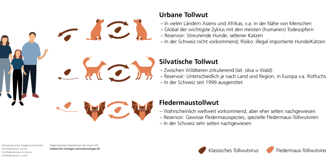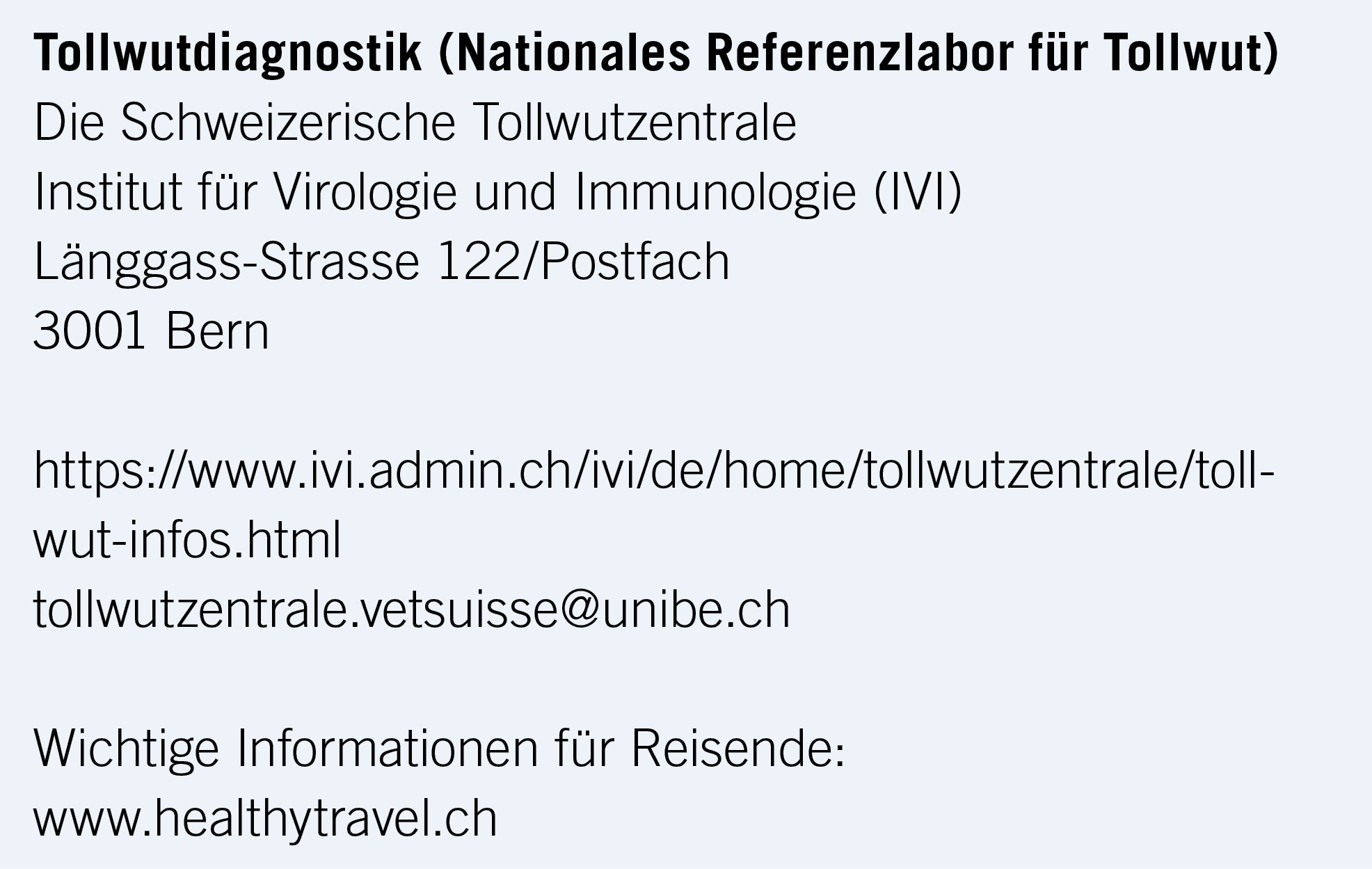 5. Institut für Virologie und Immunologie (IVI), Universität Bern. Tollwutzentrale: Die Epidemiologie der Tollwut (cited 2023 11 08, accessed 2024 02 22). URL: https://www.ivi.admin.ch/ivi/de/home/tollwutzentrale/tollwut-ch.html