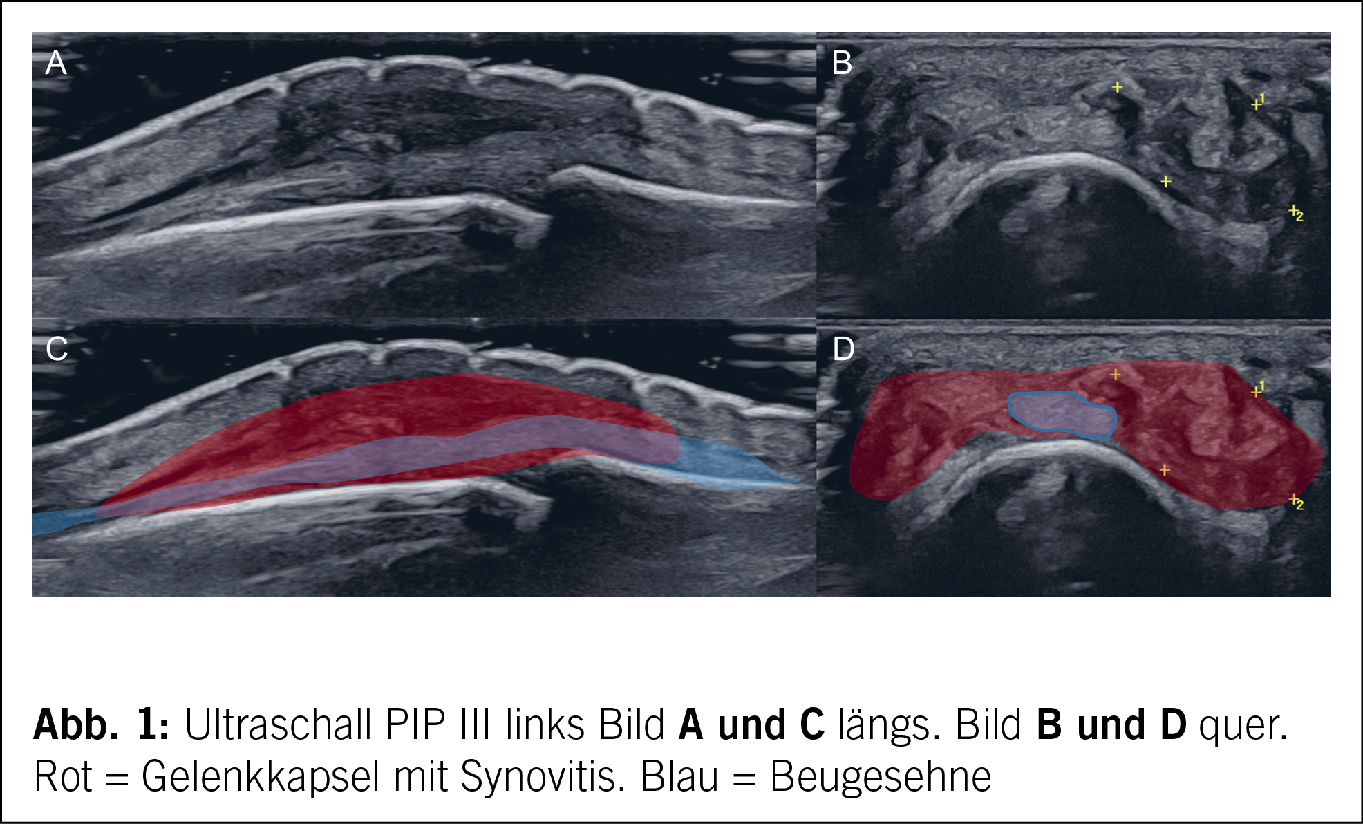 Wir berichten über eine 47-jährige Patientin, die sich in der rheumatologischen Sprechstunde mit einer schmerzhaften Schwellung und Überwärmung des proximalen Interphalangealgelenkes (PIP) III der linken Hand vorstellte. Die Patientin berichtete, dass die Beschwerden innerhalb eines halben Tages aufgetreten seien und seither persistieren. Zudem bestehe eine ausgeprägte morgendlich betonte Steifigkeit im Finger mit feinmotorischen Einschränkungen im Alltag. In der klinischen Untersuchung bestand ein palpabler Erguss mit lokaler Druckdolenz und leicht eingeschränktem Beugedefizit im PIP III links. In den übrigen Gelenken fanden sich keine tastbaren Synovitiden oder Druckdolenzen. Systemanamnestisch und in der körperlichen Untersuchung bestanden keine weiteren Hinweise für eine Kollagenose (Sicca-Symptomatik, Raynaund Phänomen, Hautfibrose, Sehnenreiben, Hautveränderungen, Aphthen etc.). Laborchemisch bestand keine humorale Entzündungsaktivität. Der Rheumafaktor und die Anti-CCP-Antikörper sowie der antinukleäre Antikörper-Titer (< 1:320) waren unauffällig. Die Harnsäure war normwertig. Die durchgeführten Röntgen der Hände und Füsse zeigten keine (post-)entzündlichen (Erosionen, Verkalkungen) oder degenerativen (subchondrale Sklerose, Gelenkspaltverschmälerung, Osteophyten) Veränderungen.