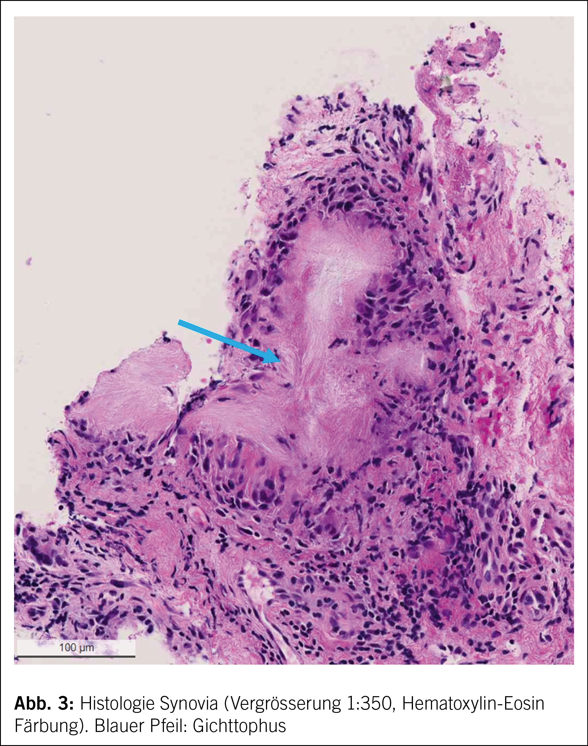 Histologisch lassen sich auch an Formalin fixiertem Gewebe sog. Gichtthophi nachweisen, auch wenn die Kristalle herausgewaschen sein sollten während der Gewebeprozessierung im Labor (Abb. 3). Solche typischen Veränderungen zeigen eine faserige Grundsubstanz mit einem entzündlichen Randsaum (meist Histiozyten und Lymphozyten) auf. Somit konnte die Diagnose einer Gicht gestellt werden.