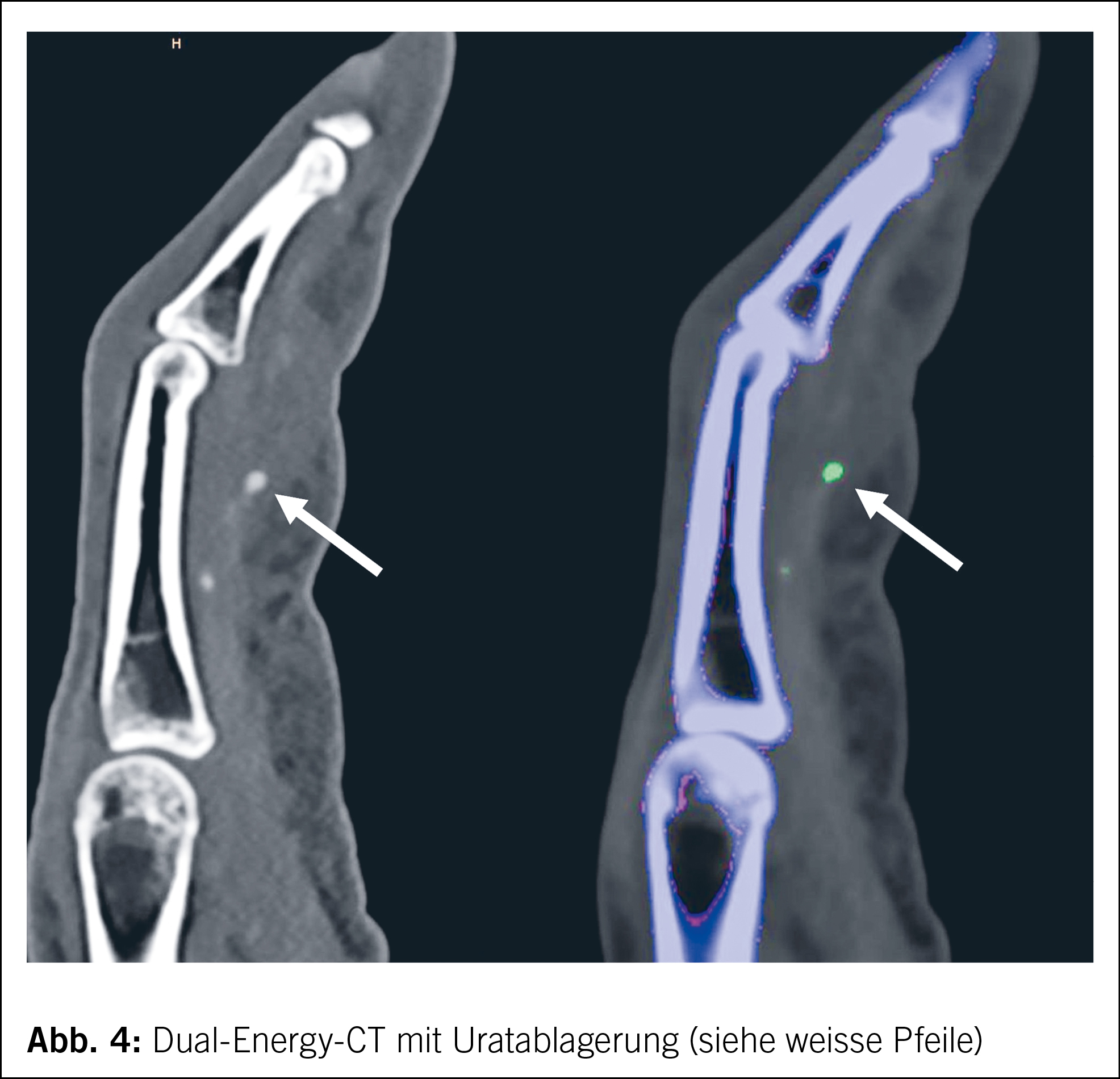 In der ergänzend durchgeführten Dual-Energy Computed Tomography (DECT) der Hände zeigte sich eine kleine Uratablagerung in der Sehnenscheide um die Flexorsehne des Mittelfingers auf Höhe der Phalanx proximalis des dritten – biopsierten – Fingers (Abb. 4).