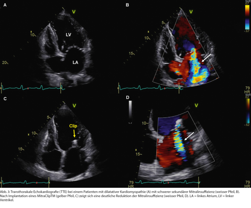Dies traf auf einen 66-jährigen Patienten zu, bei dem eine dilatative Kardiomyopathie bekannt war. In letzter Zeit beklagte er eine zunehmende Leistungsintoleranz. Bei dilatiertem LV mit schwer eingeschränkter LVEF fand sich neu eine schwere sekundäre MI (Abb. 3 A, B). Bei hypotonen Blutdruckwerten mit Schwindelsymptomatik liess sich die medikamentöse Herzinsuffizienztherapie nicht weiter ausbauen. Da angiografisch keine behandlungsbedürftige koronare Herzkrankheit vorlag, wurde der Patient in Hinblick auf eine TEER abgeklärt (Tab. 1). In der TEE waren die anatomischen Verhältnisse hierfür geeignet. Die TEER mittels eines MitraClipTM konnte in der Folge erfolgreich durchgeführt werden, was zu einer deutlichen Reduktion der Mitralinsuffizienz führte (Abb. 3 C, D).
