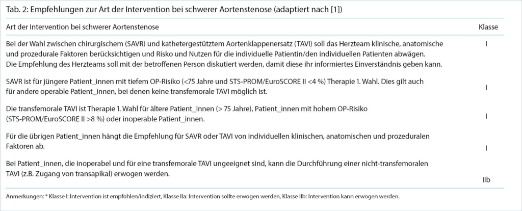 Beim Entscheid, ob bei einer Patientin/einem Patienten ein chirurgischer oder ein transkathetertechnischer Aortenklappenersatz durchgeführt werden soll, werden in erster Linie das Alter und das individuelle OP-Risiko berücksichtigt (Tab. 2) [1].