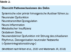 Das Delir ist das häufigste neuropsychiatrische Syndrom bei hospitalisierten Personen [1]. Die Häufigkeit hängt von der untersuchten Spitalpopulation ab. Sie liegt auf internistischen und chirurgischen Bettenstationen bei 20–40 % [2, 3] und bei über 50–60 % in der Palliativmedizin [4] und auf Intensivstationen [5]. Klinisch zeigen sich akut und im Verlauf fluktuierende Störungen kognitiver Funktionen und neuropsychologische Defizite (Kasten 1) [6, 7]. Zum Delir führen ein oder meistens mehrere medizinische Auslöser, auch Präzipitationsfaktoren genannt. Systemische Trigger-Faktoren, zum Beispiel eine Sepsis oder Leberfunktionsstörung, oder eine primär hirnorganische Ursache, zum Beispiel ein Schlaganfall oder Schädel-Hirn-Trauma, führen zu einer Kaskade an pathophysiologischen Prozessen im Gehirn. Ein Delir kann auch post-operativ auftreten und muss gegenüber anderen post-operativen neurokognitiven Störungen abgegrenzt werden (hierzu zählen z.B. die verzögerte neurokognitive Erholung und die postoperative kognitive Dysfunktion) [8, 9]. Der Begriff Delir ist zunächst eine Sammelbezeichnung für ein neuropsychiatrisches Syndrom. Zur Vereinheitlichung der Begriffe wird von der Nutzung anderer, früher geläufiger Bezeichnungen, wie z.B. akute organische Psychose oder Durchgangssyndrom, abgeraten [10]. Die Manifestation bei unterschiedlichsten Ursachen und in verschiedenen Fachdisziplinen hat zur Herausbildung einiger krankheitsspezifischer Bezeichnungen für das Delir geführt, z.B. hepatische und metabolische [11], oder septische Enzephalopathie [12]. Diese Herangehensweise unterstreicht die naheliegende Annahme, dass unterschiedliche pathophysiologische Prozesse zum Delir führen und unterschiedliche Behandlungsmöglichkeiten existieren, führt aber auch dazu, dass Personen mit ähnlicher neuropsychiatrischer Symptomatik in den inzwischen verfügbaren grossen Delirstudien bislang keine Berücksichtigung fanden. Wichtig ist die Beachtung der Delirkriterien nach DSM-5, da es akute kognitive Störungen gibt, die die Kriterien nicht erfüllen [13]. Eine Übersicht über die pathophysiologischen Prozesse, auch Endotypen genannt, wird in Kasten 2 gegeben [14]. All diese Mechanismen führen zu einer Systemintegrationsstörung und einer Desorganisation neuronaler Netzwerke [3]. Menschen mit Delir haben unabhängig von der Grunderkrankung und demografischen Faktoren eine erhöhte kurz- und mittelfristige Mortalität und Pflegebedürftigkeit nach Spitalaustritt [15, 16, 17]. Viele Patientinnen und Patienten, aber auch ihre Angehörigen und Pflegepersonen, erinnern das Delir als traumatische Erfahrung [18]. Ausserdem ist das Delir unter anderem aufgrund des hohen Pflegeaufwandes, verlängerter Aufenthaltsdauer, medizinischer Komplikationen und hoher post-stationärer Pflegebedürftigkeit mit hohen Kosten verbunden [19, 20]. Im Rahmen dieser Übersicht kann nicht näher auf die Besonderheiten des Delirs in der Pädiatrie eingegangen werden, hierzu sei auf entsprechende Übersichten verwiesen [21, 22].