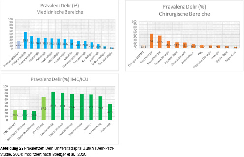 Es gibt mehrere Möglichkeiten, die Risikofaktoren für das Delir einzuteilen. Eine Möglichkeit ist die Einteilung nach modifizierbaren und nicht modifizierbaren Faktoren, eine andere nach pharmakologischen und nicht pharmakologischen Faktoren. Im Folgenden soll jedoch näher auf die Unterteilung nach prädisponierenden (Anfälligkeit) und präzipitierenden (Auslöser) Faktoren eingegangen werden. Ein lange etabliertes Delir-Prädiktionsmodell beschreibt das Verhältnis dieser Faktoren [23]: Bei hoher Prädisposition reicht ein relativ schwacher Auslöser aus, wohingegen bei niedriger Prädisposition ein schwerwiegender vorhanden sein muss (Abb. 1). Das am weitesten verbreitete Risikoprofil allgemein hospitalisierter Personen umfasst fortgeschrittenes Lebensalter, vorbestehende Demenz, reduzierter funktioneller Status (z.B. Seh-/Hörstörung und Immobilität) bei multiplen Komorbiditäten und Polypharmazie [24]. Zwischen der Demenz und dem Delir besteht eine bidirektionale Beziehung: Menschen mit Demenz haben ein erhöhtes Risiko für ein Delir und Menschen mit Delir haben ein erhöhtes Risiko, eine Demenz zu entwickeln [25, 26]. Es ist hervorzuheben, dass die pathologischen Begleiterscheinungen im Rahmen geriatrischer Syndrome ausschlaggebend sind und nicht das Alter allein [27, 28]. In einer prospektiven Kohortenstudie am Universitätsspital Zürich wurden Risikoprofile von Patientinnen und Patienten mit Delir in über 30 Fachabteilungen untersucht (Delir-Path) [29]. Die Prävalenz variierte zwischen den betreuenden chirurgischen und medizinischen Fachabteilungen und erreichte die höchsten Zahlen auf den Intensivstationen (Abb. 2) [30]. Je nach Fachabteilung konnten individuelle Risikoprofile herausgearbeitet werden. Bei Schlaganfallpatientinnen und -patienten konnte dabei ein Krankheits-spezifisches Profil gefunden werden, bei dem vor allem die Schlaganfallschwere, die Art des Schlaganfalls und das Auftreten epileptischer Anfälle die Wahrscheinlichkeit für ein Delir erhöht ist [19]. Auf der neurologischen Bettenstation waren hingegen ein höheres Lebensalter (≥ 65 Jahre), epileptische Anfälle und ein reduzierter funktioneller Status entscheidend für das Risiko, ein Delir zu entwickeln [31]. In der Neurochirurgie waren eine reduzierte kognitive Reserve durch Schlaganfallvorgeschichte und Herzinsuffizienz bei gleichzeitigem Vorhandensein von Schädel-Hirn-Trauma und intrakranieller Blutung unter den relevantesten Risikofaktoren [32]. In der Neurochirurgie zeigten sich auch spezifisch chirurgische Faktoren, die zu einer Erhöhung des Delirrisikos führen, wie mehrere Eingriffe, künstliche Beatmung und Bedarf einer intensivmedizinischen Behandlung als Risikofaktoren. Im Kontrast hierzu ergab sich auf der kardiologischen Bettenstation ein typisch geriatrisches Risikoprofil mit Demenz, funktioneller Behinderung und höherem Lebensalter, bei geringerer Relevanz der kardiologischen Grunderkrankung [33]. Zuletzt ist von den Bettenstationen auch die Kohorte der Hepatologie und Gastroenterologie zu erwähnen, bei der sich besonders deutlich zeigte, dass auch junge Patientinnen und Patienten bei einem entsprechend starken auslösenden Faktoren ein Delir entwickeln können, etwa bei akutem Nierenversagen oder eine Leberfunktionsstörung [34]. Eine grosse und wichtige Untergruppe von Patientinnen und Patienten entwickelt bei der Behandlung auf der Intensivstation ein Delir [35]. Zusätzlich zu den bereits genannten allgemeinen Risikofaktoren sind bei Intensivpatientinnen und -patienten besonders sedierende Medikation, maschinelle Beatmung und akute metabolische Störungen hervorzuheben. Im Delir-Path konnte gezeigt werden, dass der Anteil von Patientinnen und Patienten unter 65 Jahren mit Delir auf den Intensivstationen besonders hoch ist (70 bis über 80 %) [36].