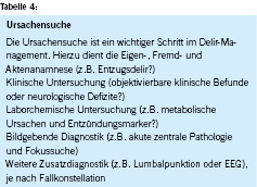 Das erste Ziel ist die Prävention des Delirs. Hierzu müssen Risikopatientinnen und -patienten identifiziert werden, wozu die individuellen Risikoprofile dienen. Praktisch helfen dabei routinemässige Screenings bei Spitaleintritt, frühzeitige Versorgung mit Hilfsmitteln, adäquate Schmerztherapie und die Vermeidung delirauslösender Substanzen [45, 46]. Derzeit gibt es keine Evidenz für eine routinemässige pharmakologische Delirprävention mit Haloperidol oder atypischen Neuroleptika [46, 47]. Wenn das Delir eingetreten ist, steht an erster Stelle die Suche nach einer oder mehreren behandelbaren Ursachen mittels klinischer Untersuchung und Zusatzdiagnostik (Kasten 4). Parallel ist frühzeitig ein nicht-pharmakologisches Delirmanagement mit Multi-Komponenten-Programm indiziert [48]. Hierzu gehören Reorientierung, das Einsetzen fester Bezugspflege, Einbinden der Angehörigen, falls möglich Ausschleichen/Absetzen delirbegünstigender Medikamente (z.B. Anticholinergika) und adäquate Schmerzkontrolle [49, 50]. Auf der Intensivstation hat sich das ABCDEF-Schema bewährt [51]: «Assessment» für die Behandlung von Schmerz, «Breathing» steht für Aufwach- und Spontanatmungsversuche, «Choice» steht für die gezielte delirreduzierende Analgosedation, «Delirium»-Management wie bereits ausgeführt, «Early» steht für Frühmobilisation und «Family» für das Einbeziehen und Stärken von Familie und anderen Bezugspersonen. Hinsichtlich sedierender Medikation gibt es Evidenz für einen Vorteil durch Einsatz von Dexmedetomidin in spezifischen Situationen, z.B. bei Personen mit erschwerter Extubation [52]. Auch nach Eintreten eines Delirs gibt es keine Belege für den routinemässigen Einsatz von sedierender oder antipsychotischer Medikation zur Verkürzung der Delirdauer oder Verringerung des Delir-Schweregrades [52, 53]. Je nach Auslöser des Delirs sollte eine spezifische Therapie eingeleitet werden. So unterscheidet sich das Management des Alkohol- und Opiat-Entzugsdelirs deutlich vom Management anderer Delirunterformen [54]. Insbesondere der Einsatz von Benzodiazepinen beim Alkoholentzugsdelir sollte hervorgehoben werden, weil dieser bei anderen Delirursachen aufgrund seiner potenziell delirverstärkenden Wirkung nicht allgemein empfohlen wird [55, 56, 57]. Der Einsatz von Antipsychotika beim Delir sollte unter anderem bei starker Agitation, Angst, Eigen- und Fremdgefährdung erwogen werden [58].
