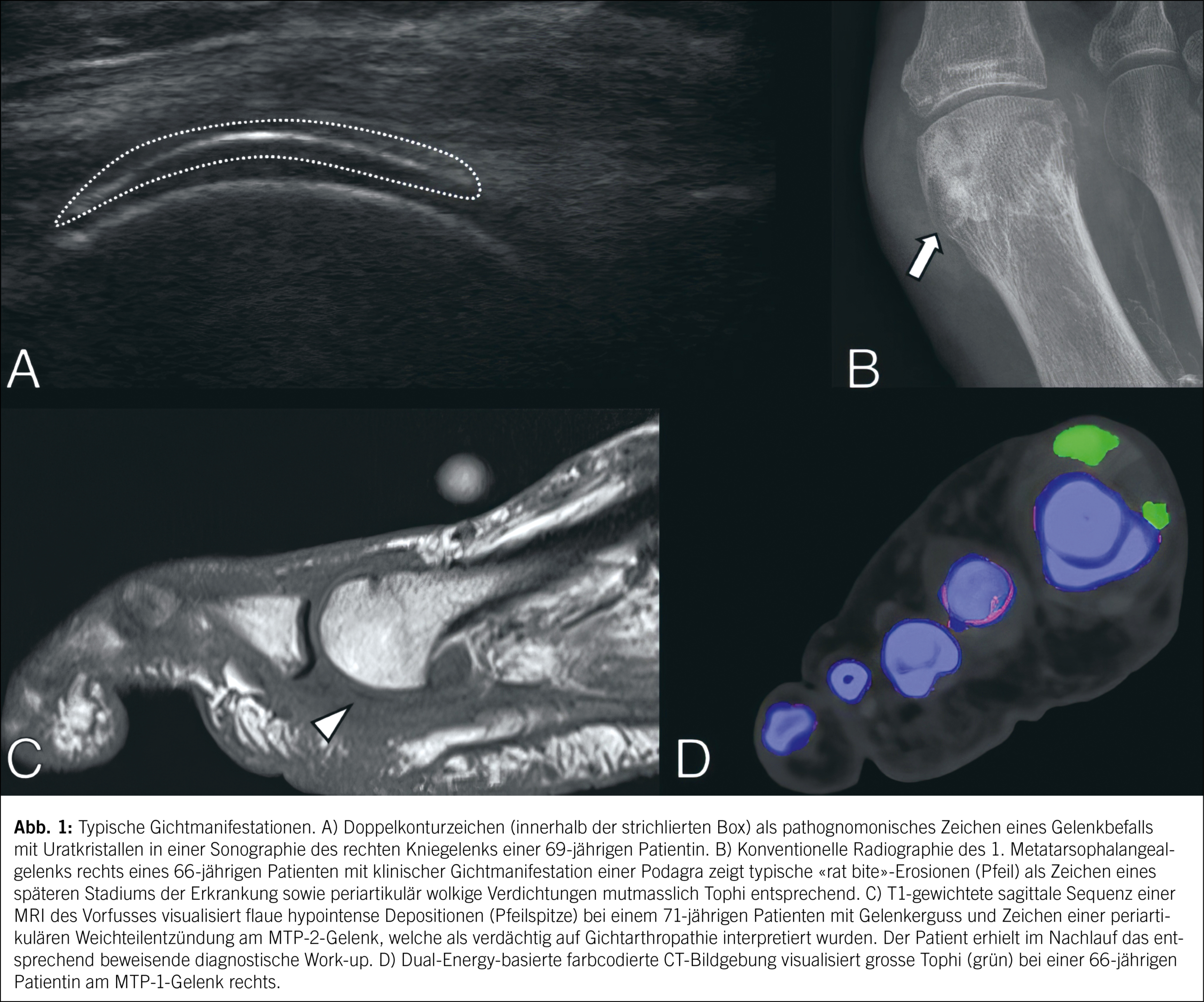 Die zunehmende Komplexität der bildgebenden sowie mikroskopischen Methoden führte insbesondere in den vergangenen zwei Jahrzehnten zunehmend dazu, dass sowohl verschiedene Arten von Kristalldepositionen in ein und demselben Gelenk nachweislich koexistent sein können als auch sehr subtile Weichteilveränderungen bereits lange vor bildgebender manifester Deposition makroskopischer Verkalkungen mittels moderner Radiodiagnostik detektiert werden. In Kombination mit rasenden Entwicklungen auf dem Gebiet der Therapie von Kristallarthropathien und ihren zugrunde liegenden Systemerkrankungen resultierte daher eine zunehmend differenzierte Ansicht und Interpretation an Bildbefunden, verglichen zum «State of the Art» noch vor wenigen Jahren. Erkenntnisse um verschiedene Gruppen führten dazu, dass reine Bildbefunde zunehmend im gesamten Kontext der Systemerkrankung gesetzt und so radiologisch interpretiert werden sollten. Eine Abhilfe zum besseren Verständnis von Kristallarthropathien und ihren radiologischen Befunden liefern die unregelmässig erscheinenden Guidelines und Empfehlungen hinsichtlich Bildgebung bei Gicht und anderen Kristallarthropathien der European League Against Rheumatism (EULAR), an welchen jeweils ein breites Konsortium an rheumatologischen, radiologischen und anderen Autorinnen mitwirken. Die neuesten Empfehlungen aus dem Jahr 2023 beleuchten zunehmend auch die Relevanz neuartiger Modalitäten und unterstützender Mechanismen, beispielsweise auf multispektraler Schnittbildgebung (2).