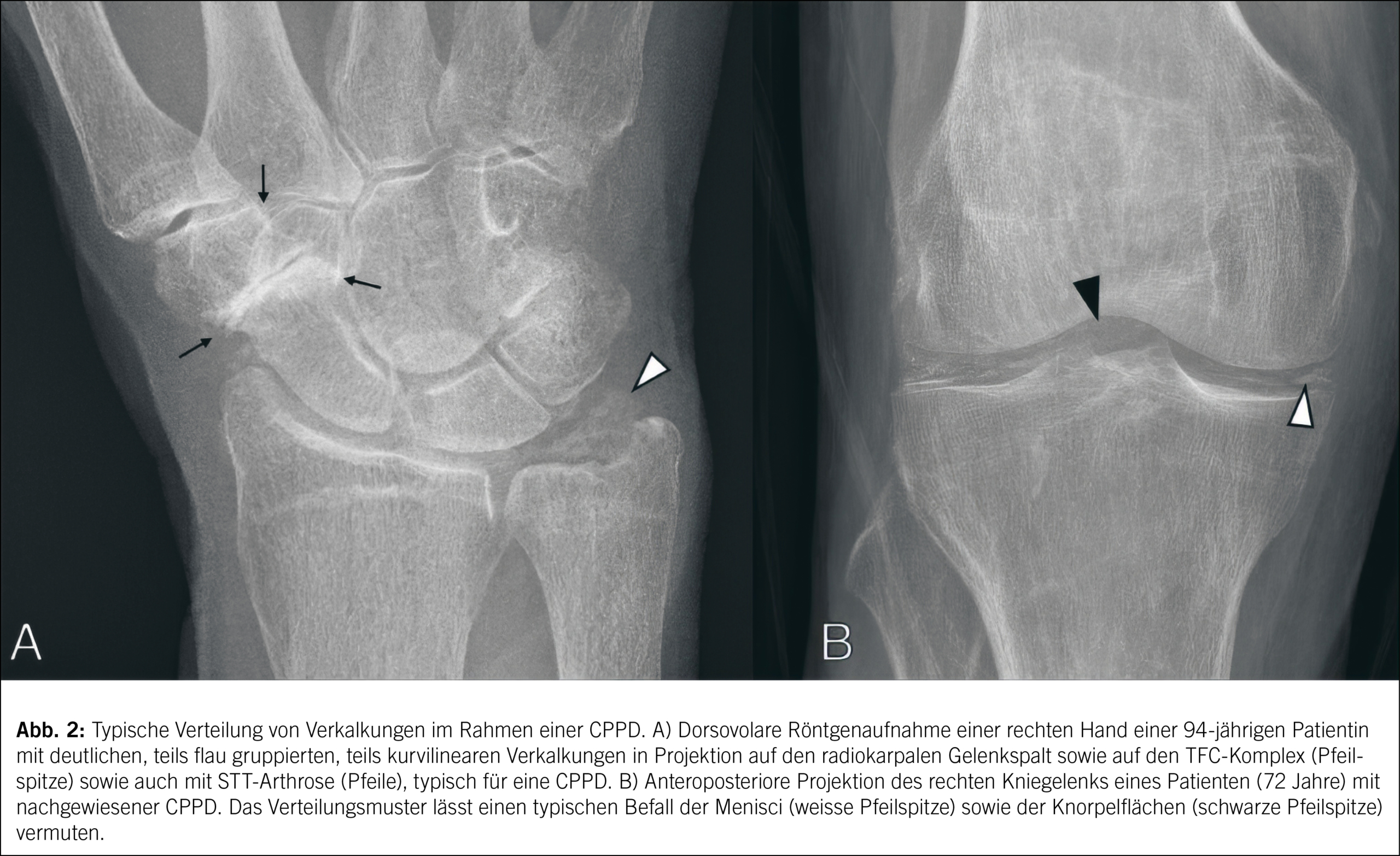 Die Diagnostik der Arthropathie durch Ablagerung von Kalziumpyrophosphat, der sogenannten Calcium Pyrophosphate Deposition Disease (CPPD), ist verhältnismässig noch komplexer im Vergleich zur Gicht. Dies führte unter anderem dazu, dass erst seit vergangenem Jahr eine evidenzbasierte Definition der Erkrankung existiert, welche von ACR und EULAR vertreten wird (15). Auch in der Diagnostik der CPPD spielen die bildgebenden Kriterien eine zunehmend grösser werdende Rolle, sodass in den aktuellen Empfehlungen bildgebende Merkmale einen existenziellen Anteil an Punkten des empfohlenen Scoring-Systems bilden. Darüber hinaus wird die CPPD als erwiesen interpretiert, wenn ein positives Resultat im Aspirat von Synovialflüssigkeit vorliegt oder pathognomonische klinische und bildgebende Befunde ohne Vorhandensein von Exklusionskriterien vorliegen (15). Konventionelle Röntgenaufnahmen sind oft die erste diagnostische Massnahme bei Verdacht auf CPPD.
