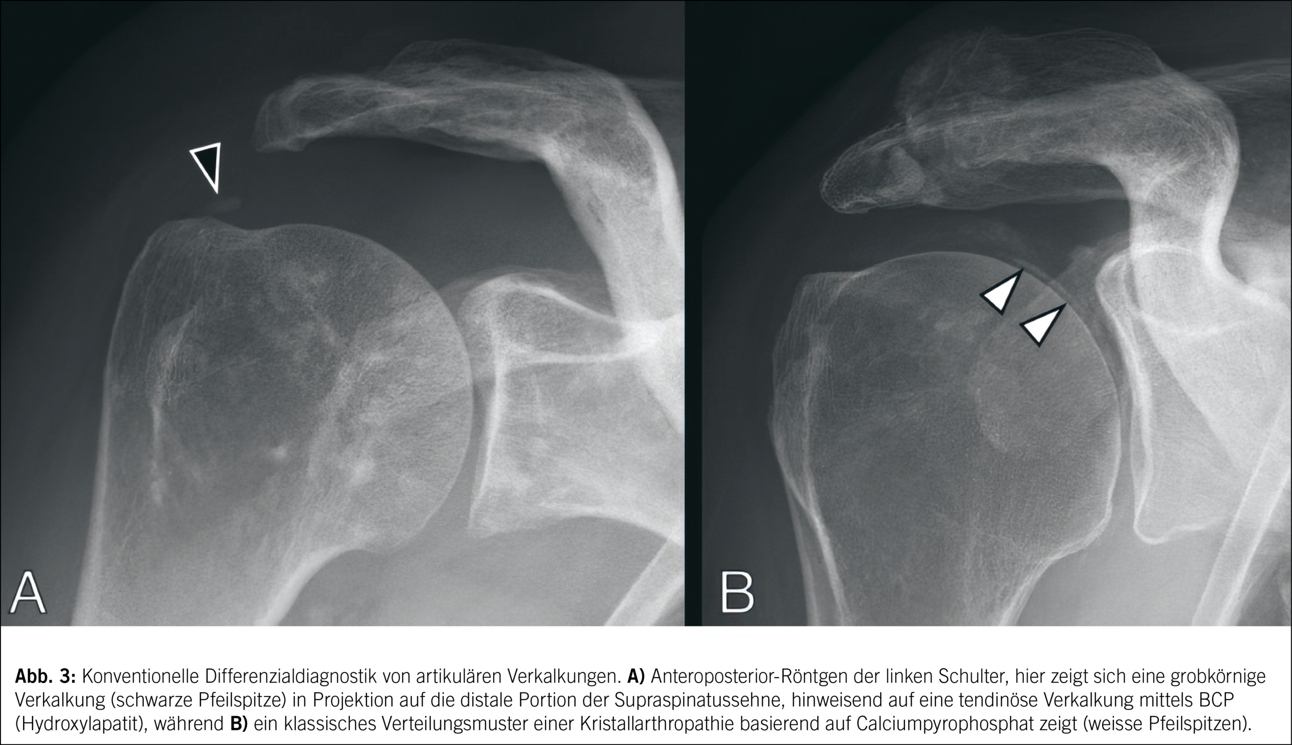 Bei der Deposition von Basiskalziumphosphaten (BCP), wie z. B. Calciumhydroxyapatit, handelt es sich um eine weitere spezifische Form von Kristallarthropathien. Die BCPD wird erstmals meist mittels Röntgen diagnostiziert, wobei Verkalkungen in den Weichteilen, insbesondere um die Gelenke, sichtbar gemacht machen. Ein besonders häufiger Befund sind dichte, amorphe Verkalkungen um Sehnen und Bänder. Bei der Tendinitis calcarea, einer häufigen Manifestation der BCPD, manifestieren sich Depositionen am häufigsten im Bereich der distalen Supraspinatussehne. Der Ultraschall bietet eine hohe Sensitivität bei der Detektion von BCPD-Verkalkungen. Diese zeichnen sich durch echogene, dichte Strukturen mit posteriorer Schallauslöschung aus (Abb. 3). Diese Methode ist besonders nützlich für die Beurteilung der Schulter, wo die BCPD am häufigsten in der Rotatorenmanschette auftritt. In der MRT können BCP-Verkalkungen indirekt durch Signalintensitätsveränderungen und umgebende Entzündungsreaktionen identifiziert werden. Hierbei ist eine niedrige Signalintensität der Verkalkungen in T1- und T2-gewichteten Sequenzen typisch. Dies ist besonders hilfreich bei der Beurteilung von BCPD im Zusammenhang mit Sehnenschäden und Enthesiopathien.