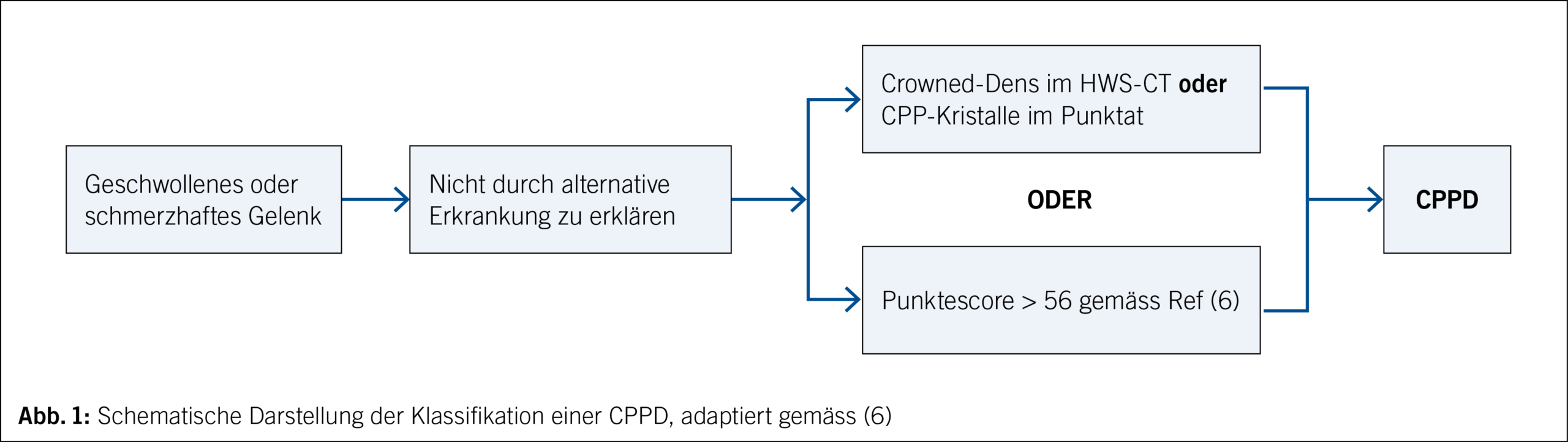 In der Akutphase führt dies zur Ausschüttung proinflammatorischer Zytokine wie IL-1-Beta und IL-18 sowie in der Folge zur IL-6-Stimulation und bisweilen stark erhöhten CRP-Werten. Lange wurden für die Diagnose einer CPPD die McCarty-Kriterien aus den 60er-Jahren verwendet, welche jedoch nie klinisch validiert wurden. Sie bestehen aus einer Trias aus Chondrocalcinose (z. B. Menisci des Kniegelenks), klinische Synovitis und Nachweis von positiv doppelbrechenden CPP-Kristallen. Da sich häufig keine Punktion des betroffenen Gelenks durchführen lässt (z. B. beim Crowned-Dens-Syndrom), sind diese Diagnosekriterien jedoch wenig praktikabel. Insbesondere eignen sie sich nicht als Klassifikationskriterien zur Durchführung von klinischen Studien. Vor diesem Hintergrund wurden im 2023 die ACR/EULAR-Klassifikationskriterien etabliert (6), welche sich aus vier klinischen, einem laborchemischen sowie drei radiologischen Domänen zusammensetzen. Hiermit kann, mittels Erreichen eines Punktescores, eine Erkrankung mit hinreichender Sicherheit als CPPD klassifiziert werden. Obwohl sich die Klassifikation als CPPD hiermit grösstenteils auf radiologische Kriterien stützen lässt, ist es wichtig, das Eintrittskriterium eines schmerzhaften bzw. geschwollenen Gelenks zu beachten (Abb. 1).