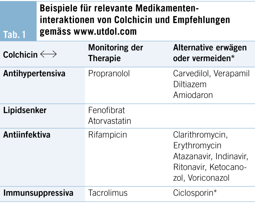 Colchicin stellt einen starken Entzündungshemmer dar, der auch eine regulierende Funktion auf das NLPR-3-Inflammasom und die Ausschüttung von IL-1-Beta und IL-18 hat. Ausserdem werden durch Hemmung der Mitose die Teilungsraten infiltrierender Neutrophiler stark reduziert. Colchicin kann, wie bei der akuten Gichtattacke, zunächst in der Dosis von 1 mg, gefolgt von 0.5 mg 1 Stunde später sowie im Anschluss 0.5 mg 2 x täglich bis zur Regredienz der Symptomatik gegeben werden. In einer neuen Studie konnte gezeigt werden, dass Colchicin in der Akutbehandlung vergleichbar effektiv zu Prednison ist (17).