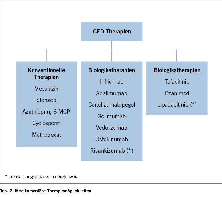 Dank intensiver Forschung auf dem Gebiet der chronisch entzündlichen Krankheiten stehen den Patienten mit CED immer mehr medikamentöse Therapien mit unterschiedlichen Wirkungsmechanismen zur Verfügung. Nebst den konventionellen Medikamenten wie Steroide, 5-ASA-Präparate oder auch Azathioprin sind in den letzten 20 Jahren biologische und niedermolekulare Wirkstoffe (engl.: small molecules) welche spezifische Entzündungsprozesse regulieren können, zur Behandlung einer CED entwickelt worden. Nebst Biologika stehen mittlerweile auch kostengünstigere Nachahmerprodukte (Biosimilars) als monoklonale Antikörper zur Verfügung. Es handelt sich hierbei um biotechnologisch aus humanen oder tierischen Organismen hergestellte Proteine. Im Gegensatz hierzu weisen die neu für die Therapie der CED zur Verfügung stehenden niedermolekularen Wirkstoffe im Vergleich zu den Biologika eine deutlich geringere Molekülmasse auf und werden in Tablettenform eingenommen.