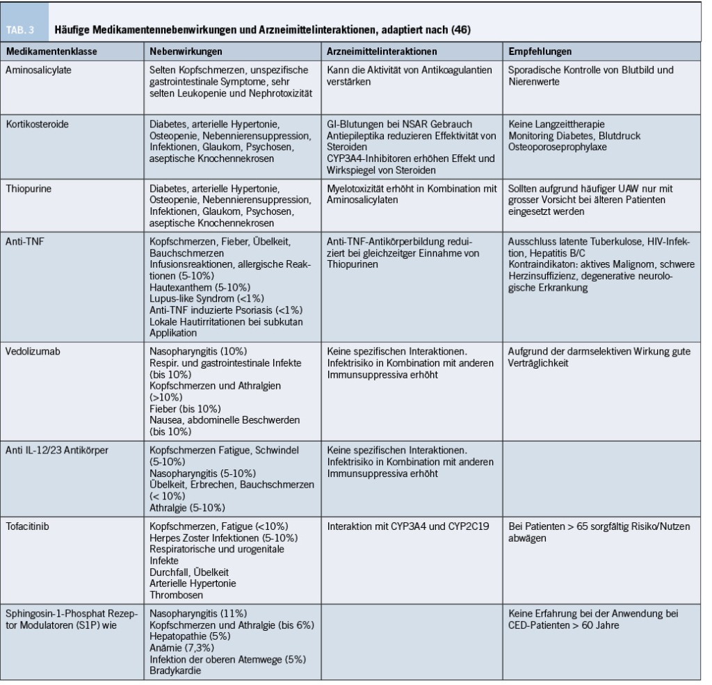 Im kommenden Abschnitt werden die aktuell verfügbaren Therapiemöglichkeiten in der Schweiz zur Behandlung einer CED erläutert, tabellarisch sind die Medikamente mit den möglichen Interaktionen und Nebenwirkung in der Grafik 3 zusammengefasst.