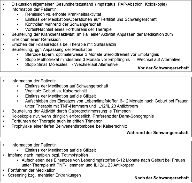 Das Ziel dieses Artikels ist es, einen Überblick über die «Best Practice» in der Betreuung von IBD-Patientinnen rund um eine Schwangerschaft zu geben, offene Fragen zu beantworten und so die Betreuung der Patientinnen zu verbessern. In diesem Zusammenhang hilfreich ist auch die in diesem Jahr publizierte aktualisierte Leitlinie zu Sexualität, Fertilität, Schwangerschaft und Stillphase der Europäischen Gesellschaft für Crohn und Colitis (ECCO), auf die sich dieser Artikel immer wieder beziehen wird (4). Eine Zusammenfassung der wichtigsten Punkte bietet die Abbildung 1.