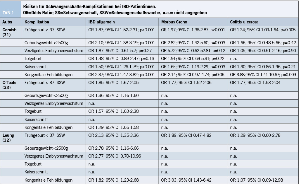 Über den Einfluss einer IBD auf den Verlauf einer Schwangerschaft gibt es mehrere grosse Metaanalysen. Cornish et al. analysierten 2007 das Outcome von 3’907 IBD-Schwangerschaften, sowie 320’531 Kontrollen. Sie beschrieben ein knapp 2-fach erhöhtes Risiko für eine Frühgeburt, ein über 2-fach erhöhtes Risiko für ein vermindertes Geburtsgewicht des Kindes, ein 1.5-fach erhöhtes Risiko für einen Kaiserschnitt und schliesslich ein knapp 2.5-fach erhöhtes Risiko für das Vorliegen einer kongenitalen Fehlbildung. Kein Unterschied zu den Kontroll-Patientinnen zeigte sich in Bezug auf Totgeburten bzw. eine zu kleine Grösse des Kindes für das Gestationsalter (Small for gestational age, SGA) (31). Detaillierte Angaben und eine Differenzierung nach MC, sowie CU zeigt die Tabelle 1. Im Jahre 2021 untersuchten Leung et al. in einer Metaanalyse aus 60 Studien den Unterschied bzgl. Schwangerschafts-Outcome zwischen IBD-Patientinnen und gesunden Kontrollen. Die Resultate waren vergleichbar (Tabelle 1) (32). O’Toole et al. analysierten 2015 die Schwangerschafts-Daten von 1’507 IBD-Patientinnen und 4‘614’271 Kontrollen. Auch ihre Angaben waren vergleichbar, mit allerdings geringerem Risiko für kongenitale Fehlbildungen (Tabelle 1) (33).