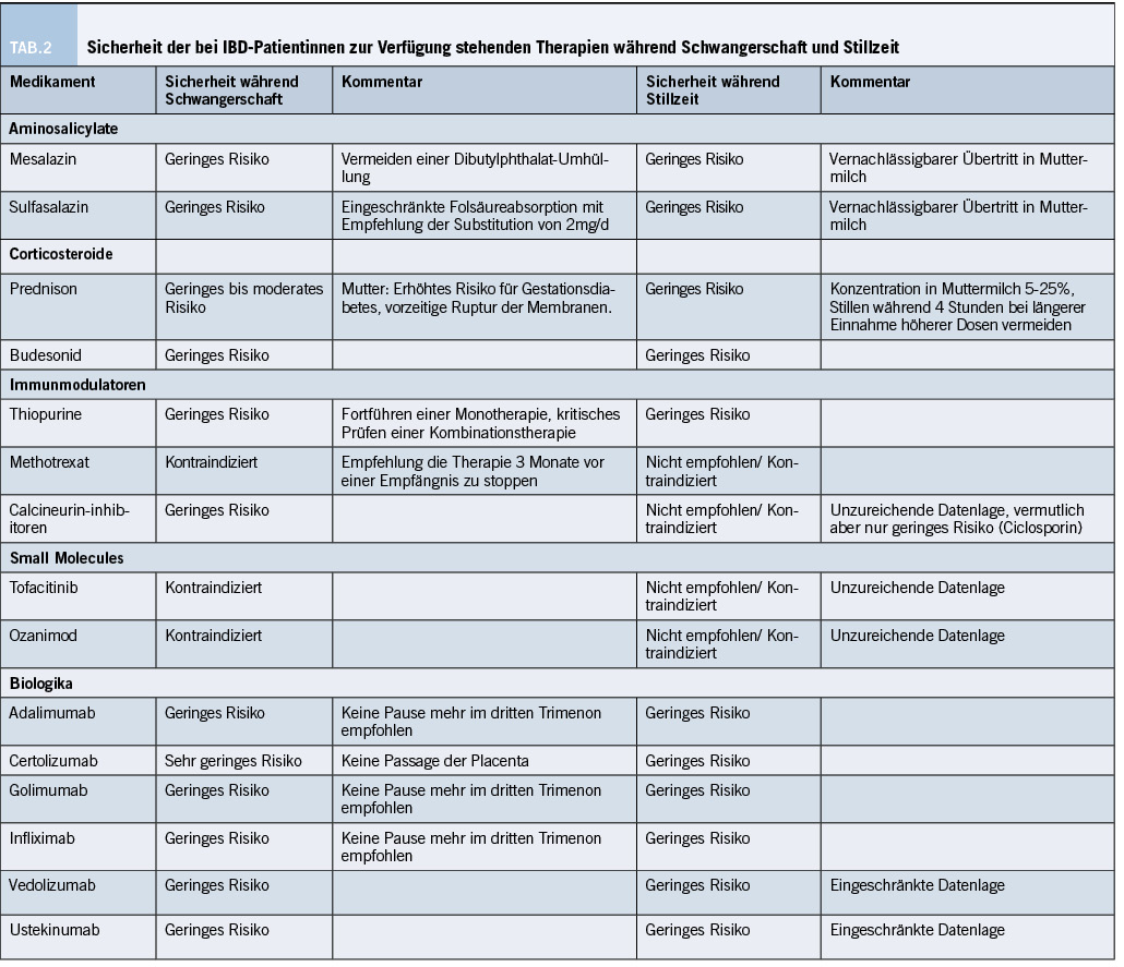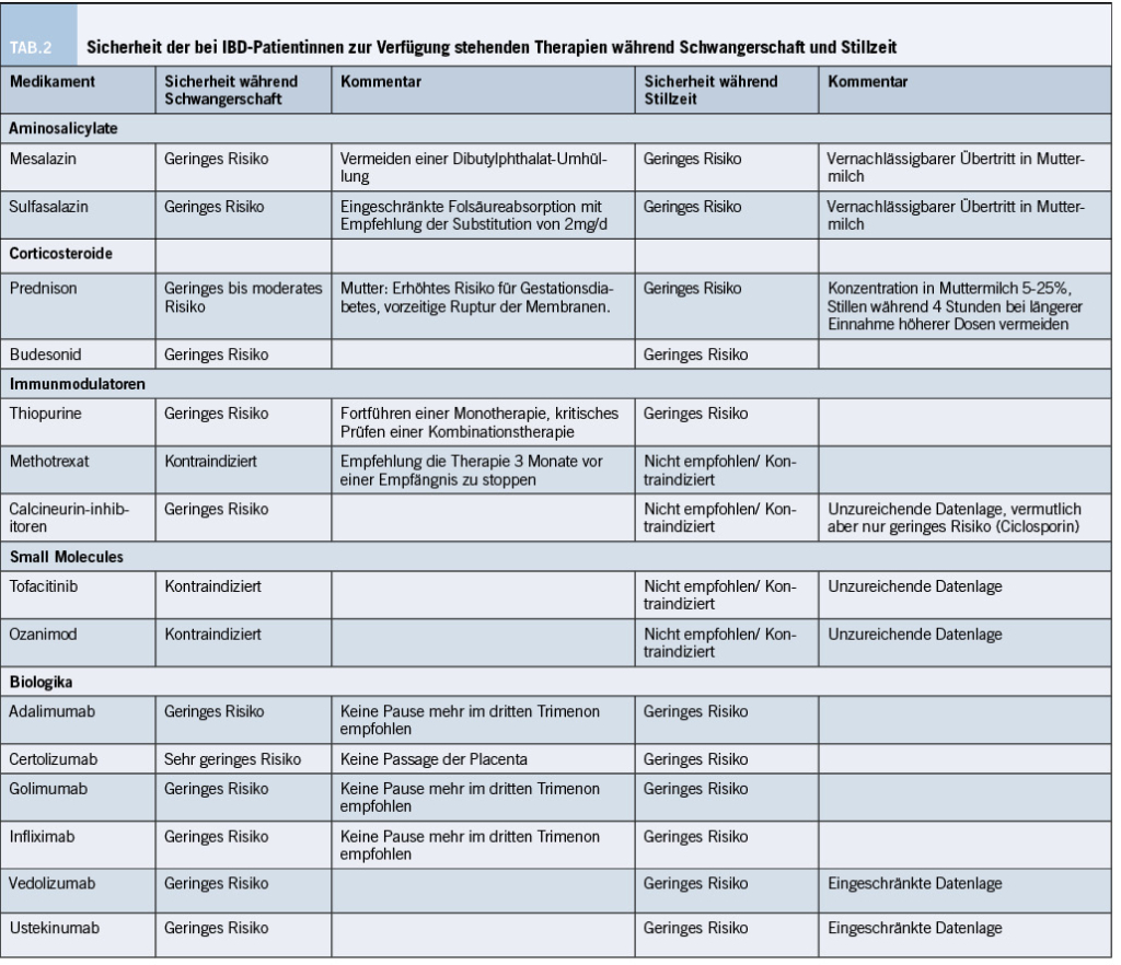 Die medikamentöse und mögliche Auswirkungen auf eine Schwangerschaft führen bei Patientinnen (und deren Ehemännern) oft zu Unsicherheiten und viele Fragen wollen beantwortet sein. Wichtig ist: Die meisten Medikamente dürfen während der Schwangerschaft eingenommen werden und weisen eine geringes Risiko auf. Die Datenlage wird im Folgenden erläutert, eine Übersicht bietet Tabelle 2.