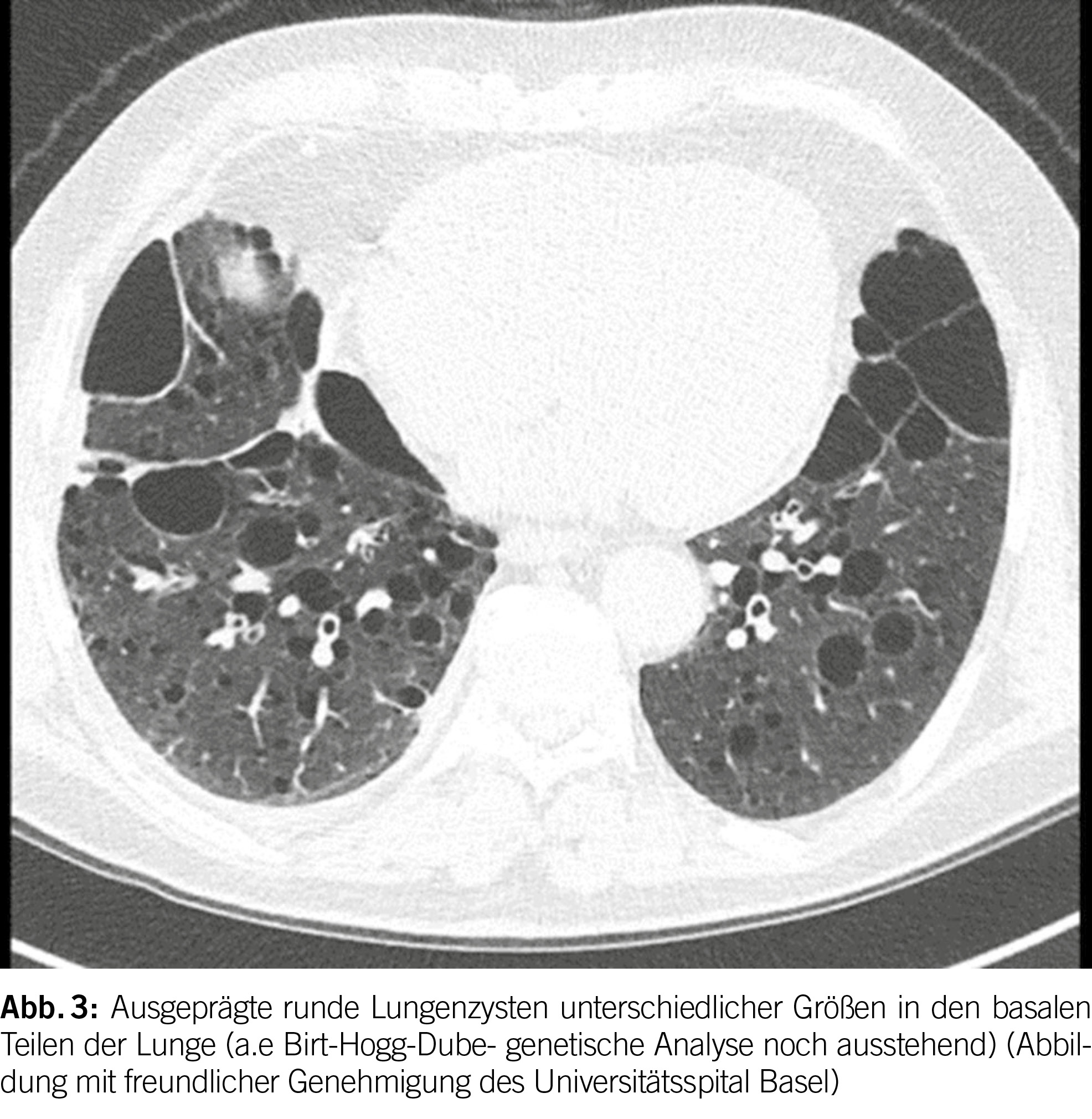 Die klinischen Manifestationen der Lungenbeteiligung bei BHD sind unspezifisch und werden hauptsächlich durch ein erhöhtes Risiko für die Entwicklung eines Pneumothorax charakterisiert (etwa 50-mal höher als in der Allgemeinbevölkerung) (3). So entwickeln etwa 24% der Patienten mit Lungenzysten bei BHD einen Pneumothorax mit einer sehr hohen Rezidivrate von 75% (1).