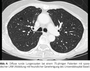 Lungenzysten bei LAM sind typischerweise rund, gleichmäßig in beiden Lungen verteilt und in Form und Grösse relativ einheitlich (Abbildung 4). Bei TSC-LAM treten häufig Lungennoduli mit einer Grösse von 2 bis 14 mm auf, die die zystischen Läsionen begleiten und eine multifokale mikronoduläre Pneumozyten-Hyperplasie repräsentieren. Bei 10% der LAM-Patienten treten weiterhin chylöse Pleuraergüsse auf.