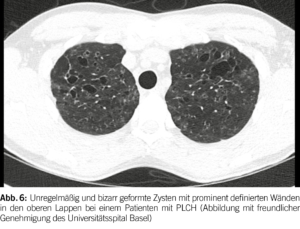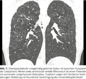 Die pulmonale Langerhans-Zell-Histiozytose (PLCH) ist eine systemische Erkrankung, die sich als diffuse zystische interstitielle Lungenerkrankung manifestiert und hauptsächlich junge Erwachsene betrifft, die rauchen. Obwohl die genaue Pathogenese der Krankheit noch diskutiert wird, besteht ein gut dokumentierter Zusammenhang mit Nikotinabusus als begünstigendem Faktor. Die Prävalenz des Zigarettenrauchens liegt bei über 90% der diagnostizierten PLCH-Patienten (18). Somatische Mutationen in den MAPK-Signalwegen, insbesondere BRAF V600E und MAPK2K1, sind in den meisten Fällen nachweisbar (19).