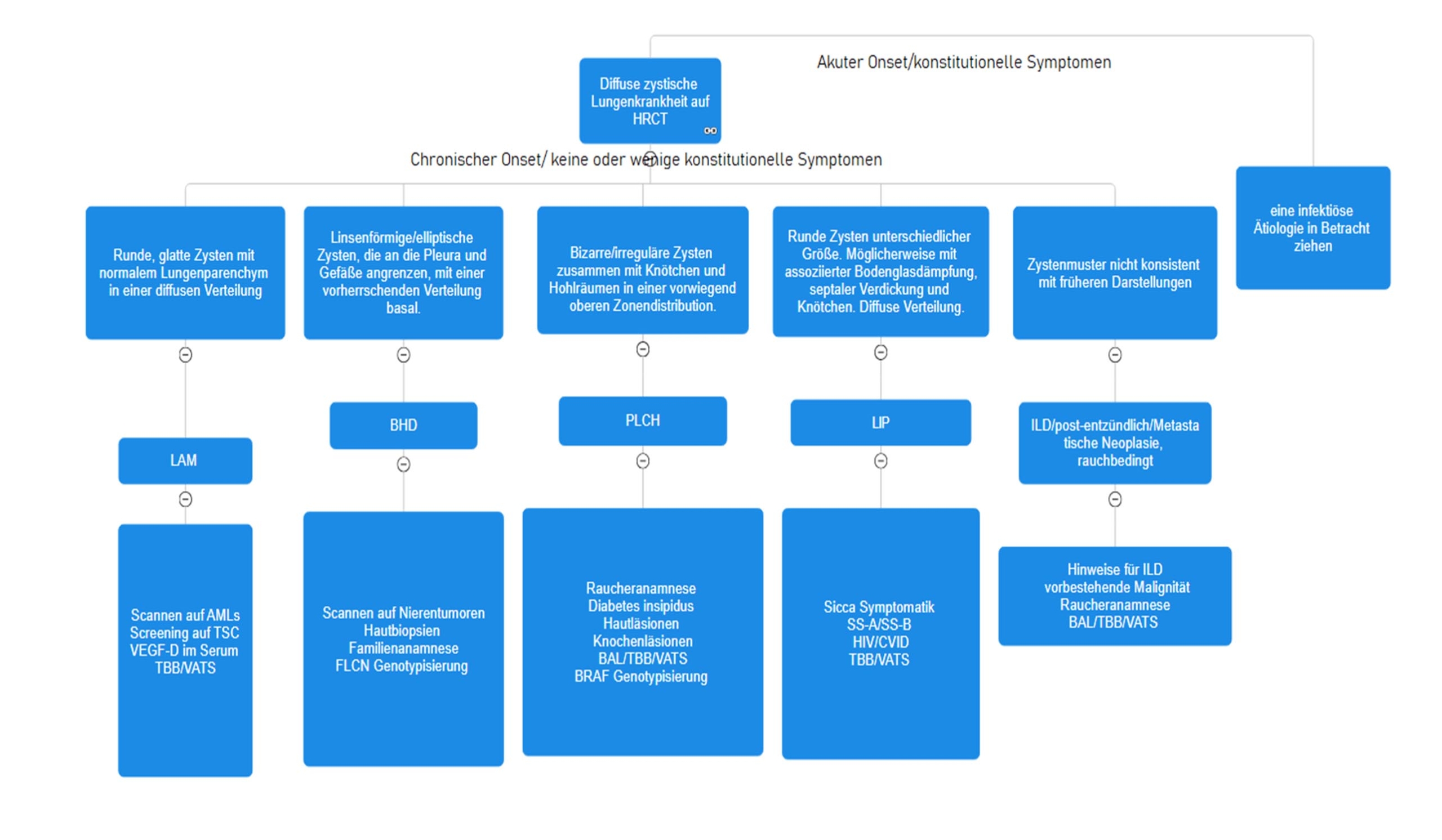 Die Durchführung einer HRCT Untersuchung zum Ausschluss einer LAM ist gerechtfertigt bei Auftreten eines Pneumothorax in der Schwangerschaft oder bei jungen, weiblichen Nichtraucherinnen, bei asymptomatischen Patienten mit TSC sowie bei der zufälligen Entdeckung von Angiomyolipomen oder unerklärlichem chylösem Aszites beziehungsweise Pleuraerguss. Die Leitlinien der ERS (European Respiratory Society) weisen darauf hin, dass die Diagnose von LAM auf der Grundlage charakteristischer zystischer Läsionen bei einem Patienten mit TSC, Angiomyolipom oder Chylothorax gestellt werden kann. Ein VEGF-D-Serumspiegel über 800 pg/ml bei einem Patienten mit typischen Zysten ist ebenfalls diagnostisch für LAM (16).