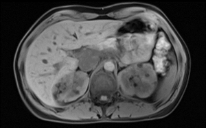 Abb. 5: MRT des Abdomens zeigt ein renalen Angiomyolipom links (orangener Pfeil) bei einer Patientin mit TSC-LAM (Abbildung mit freundlicher Genehmigung des Universitätsspital Basel)